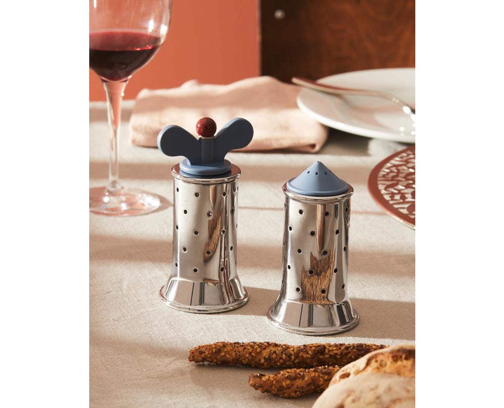 De Alessi 9098 pepermolen is een ontwerp van Micheal Graves. Hij heeft verschillende beroemde ontwerpen uitgebracht in de zelfde designstijl. Hij kan als geen ander functionaliteit van een ontwerp benadrukken door daar een opvallend of gekleurd element aan toe te voegen. De draaivlinder bovenop is waarmee je de pepermolen mee bedient en is beschikbaar in 2 verschillende kleuren, blauw en zwart. De pepermolen zelf is gemaakt van roestvrijstaal.