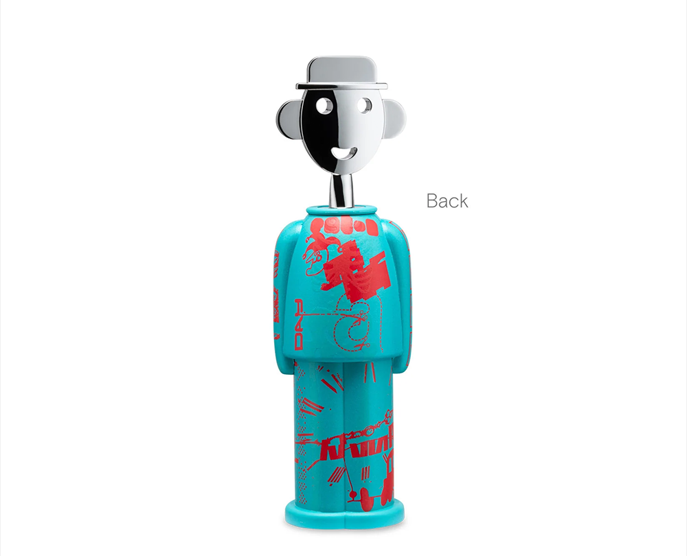 De Alessi Alessandro M. Liquid Special Edition is een unieke, met fosforescerende details versierde kurkentrekker in street art-stijl. gemaakt van duurzaam AlkiPaper®. Perfect voor designliefhebbers.