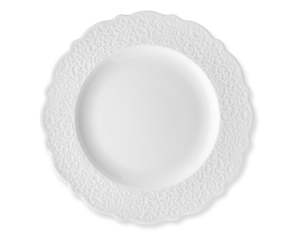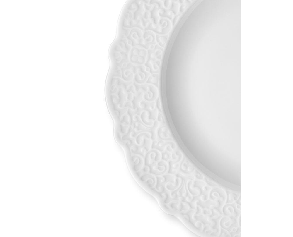 Het Alessi Dressed eetbord (4x), ontworpen door Marcel Wanders, is een verfijnd voorbeeld van elegant tafelgerei. Gemaakt van hoogwaardig wit porselein, heeft elk bord een fijn gegolfde rand en een subtiele decoratie op de rand, typisch voor de Dressed-lijn.