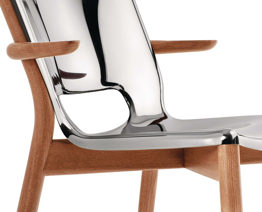 Philippe Starck geeft een eigentijdse draai aan traditioneel meubelontwerp met een stoel waarbij de minimalistische beukenhouten structuur samenkomt met een metalen schaal, die zich kenmerkt door zachte, organische lijnen. Staal onthult onder de vakkundige handen van de ontwerper onverwachte expressieve mogelijkheden, waarbij de zitting niet alleen functioneel is maar ook een sculpturaal element dat zich naar het lichaam van de gebruiker vormt dankzij de verfijnde ergonomie. De elegante rugleuning vloeit moeiteloos over in twee subtiele armleuningen, typerend voor de unieke designtaal van Starck.