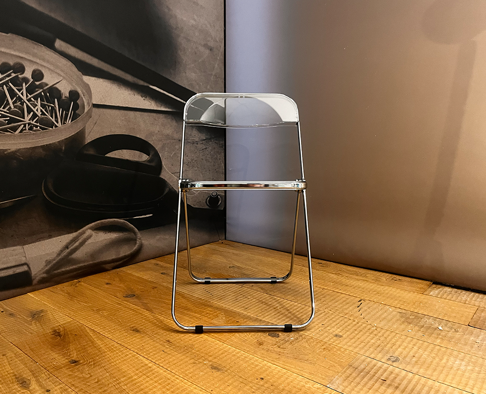 De Plia Chair, ontworpen door Giancarlo Piretti voor Anonima Castelli in 1967. Het transparante ontwerp en het ingenieuze vouwmechanisme maken de stoel bijzonder functioneel en visueel licht. Dankzij het innovatieve “three-disk pivot”-systeem kan de Plia in enkele seconden worden ingeklapt tot een minimale dikte, waardoor hij eenvoudig platzijdig kan worden opgeborgen. De combinatie van het slanke frame en de transparante kunststof zitting geeft de stoel een elegante, sculpturale uitstraling. Met miljoenen verkochte exemplaren wereldwijd, een plek in de collectie van het MoMA en diverse designprijzen blijft de Plia Chair een tijdloos icoon van modern interieur- en industrieel design.