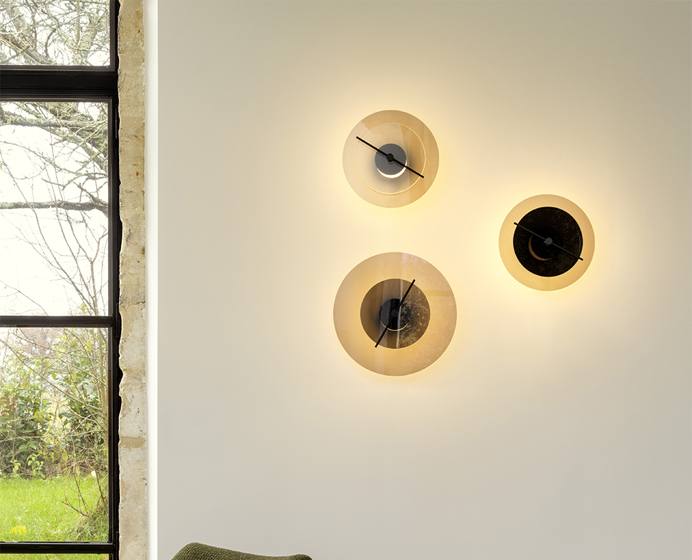 Delumina‑wandlamp met geïntegreerde LED en twee glazen schijven; de bovenste schijf is verstelbaar om lichtintensiteit te moduleren. Warm wit licht en verfijnd, sculpturaal design ideaal voor moderne interieurs.