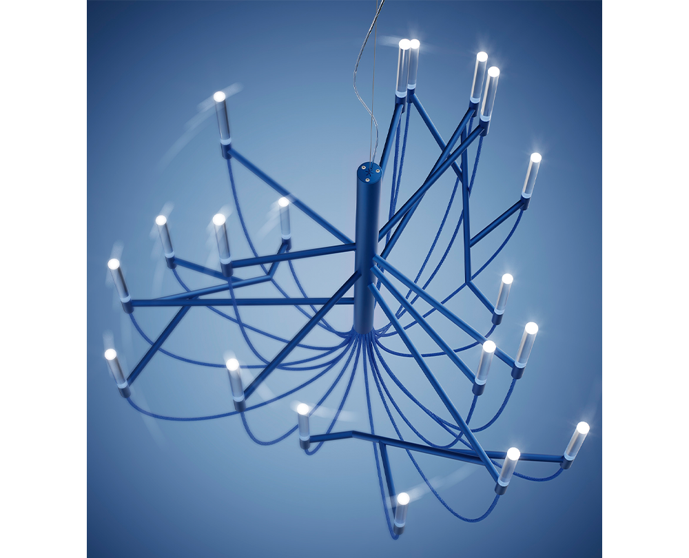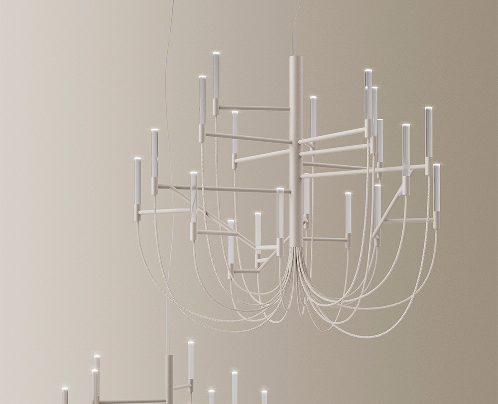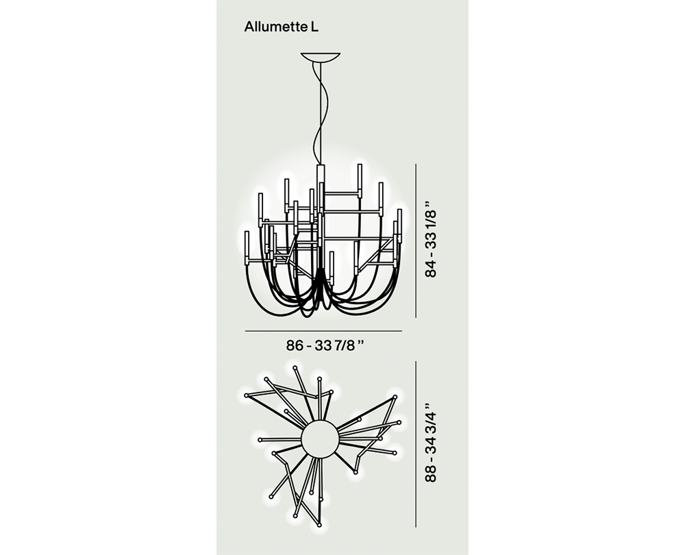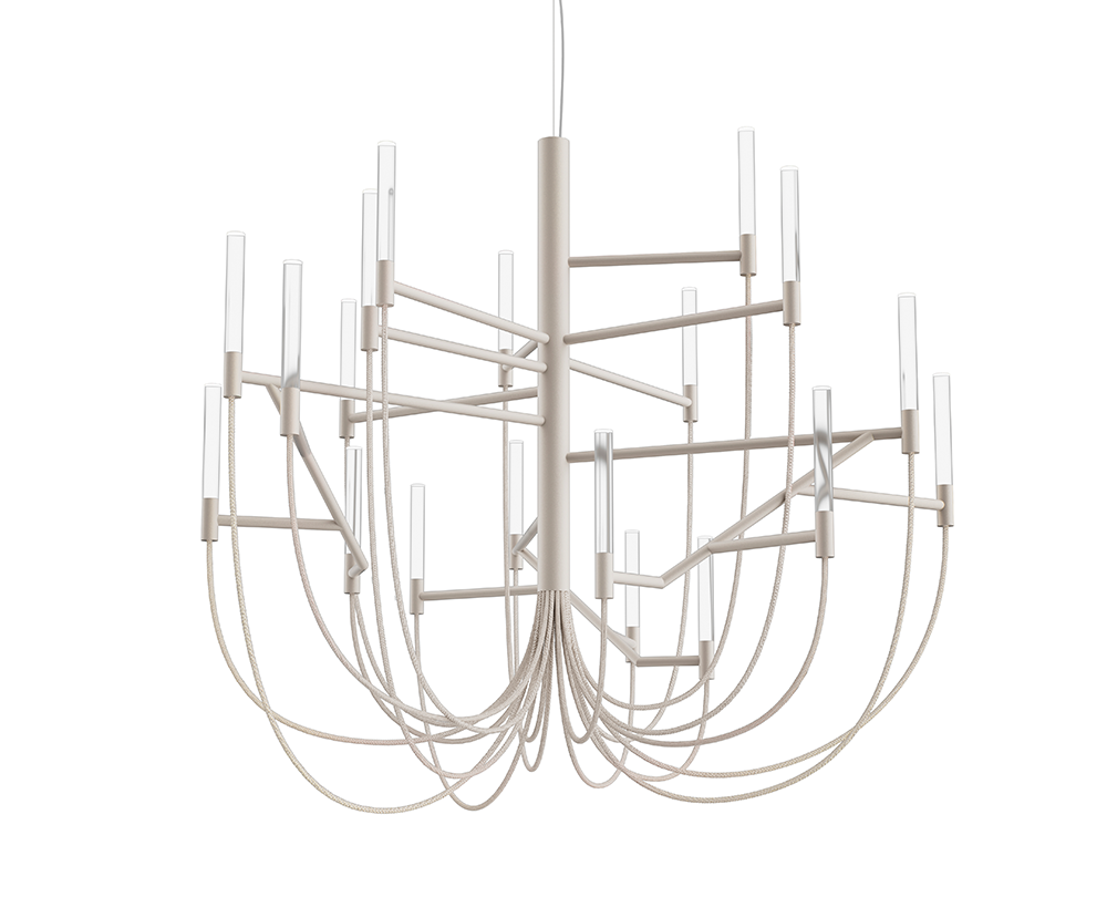 De Foscarini Allumette L Hanglamp, ontworpen door Francesca Lanzavecchia, vertaalt de klassieke kroonluchter naar een monumentale, asymmetrische lichtcompositie. De structuur in gecoat staal en aluminium ontvouwt zich in negentien armen, verbonden door lange geweven textielkabels die een dynamisch spanningsveld creëren tussen strengheid en souplesse. Aan de uiteinden zorgen ultraheldere PMMA-lichtgeleiders voor een zacht, diffuus schijnsel: het LED-licht wordt via het light-guide principe naar boven geleid en blijft subtiel hangen in de satijngeëtste, concave top, als een vlam die in de ruimte zweeft. De nauwkeurig gelaserde armen minimaliseren zichtbare lassen, waardoor het sculpturale karakter volledig tot zijn recht komt. Allumette L is ontworpen als een expressief middelpunt dat vanuit elke hoek een ander silhouet onthult.