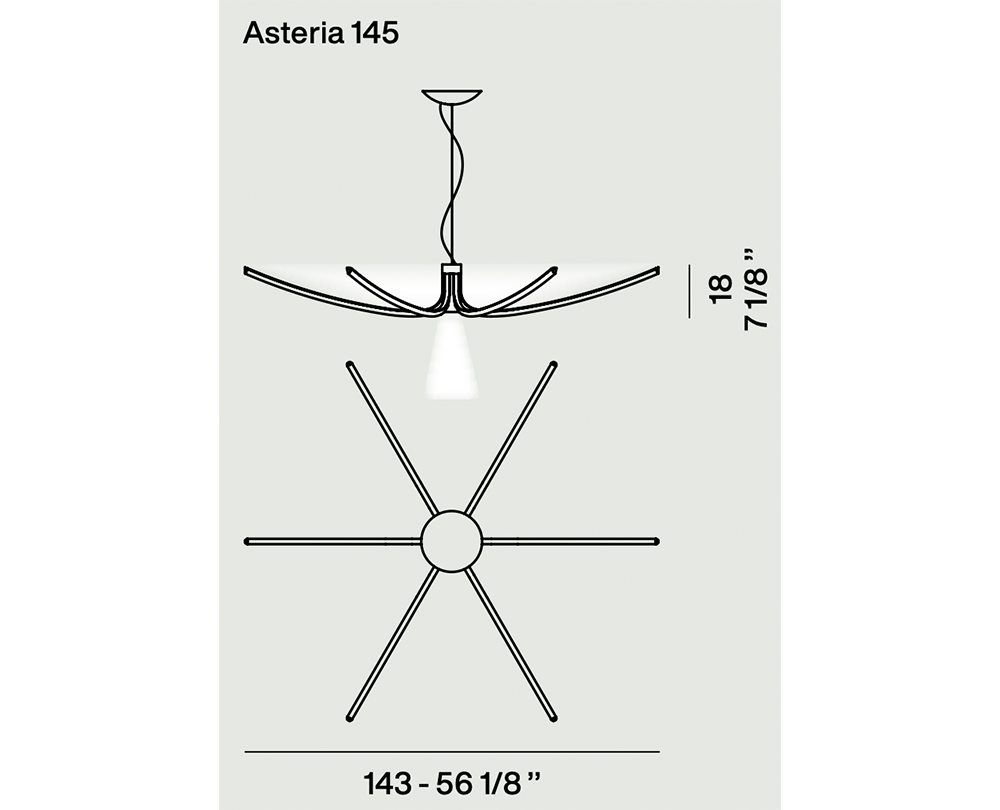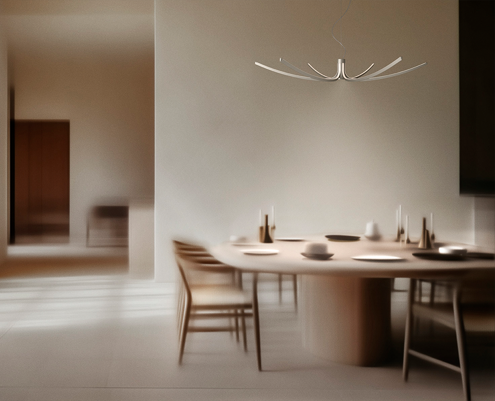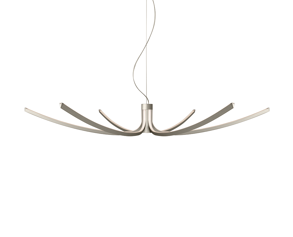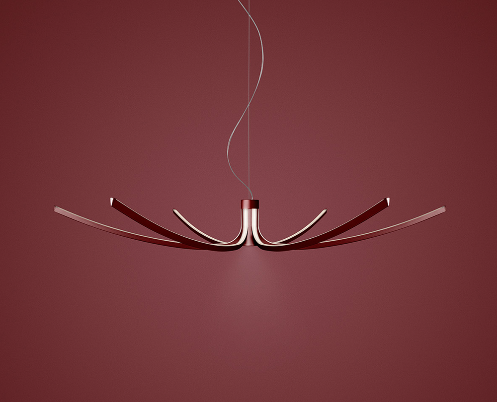 De Foscarini Asteria 145 hanglamp, ontworpen door Alberto Meda en Francesco Meda, herinterpreteert de klassieke meerarmige kroonluchter in een hedendaagse, architectonische vormentaal. De gebogen armen in vloeibaar gecoat geëxtrudeerd aluminium hebben een driehoekig profiel waarin een LED-strip subtiel is geïntegreerd. Een halftransparante siliconen diffuser leidt het licht omhoog en zijwaarts, waardoor een zachte, indirecte gloed ontstaat die het profiel van de armen als zwevende lijnen in de ruimte tekent. In het centrale cilindrische element bevindt zich een verzonken LED-spot die gericht neerwaarts licht projecteert, ideaal boven een tafel. Dankzij dubbele schakeling kunnen de opwaartse en neerwaartse lichtbronnen afzonderlijk worden gedimd. Verkrijgbaar in dark red en titanium, vormt Asteria een verfijnd evenwicht tussen techniek, vorm en sfeer.