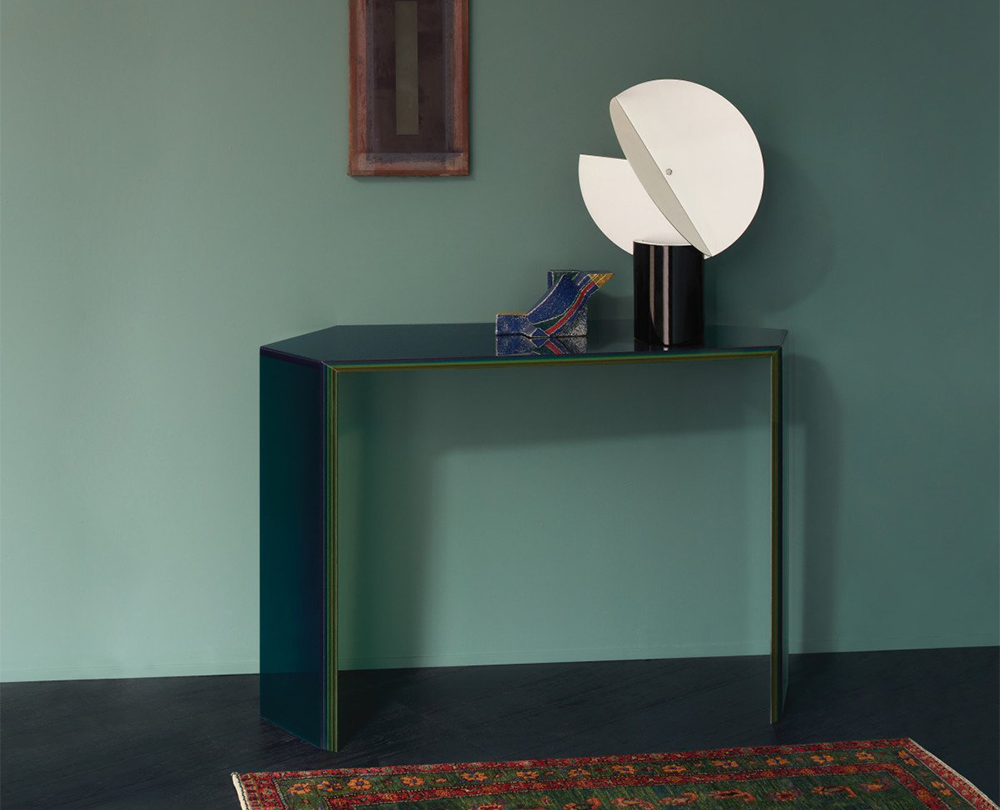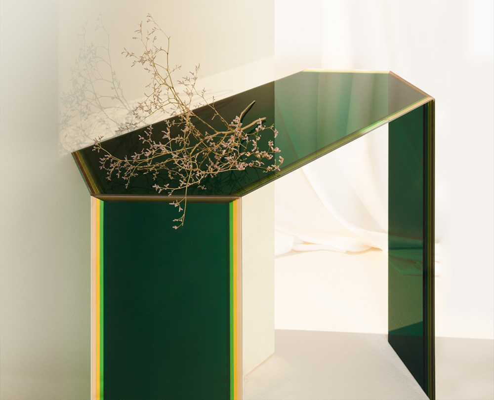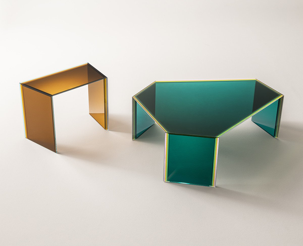De Bisel bijzettafel van Glas Italia, ontworpen door Patricia Urquiola, is een verfijnd meesterwerk van modern glasdesign. Deze collectie, bestaande uit bijzettafels, salontafels en consoles, is vervaardigd uit meerlagig en meerkleurig glas dat bestaat uit vijf lagen van 5 mm extrahelder glas. Elke laag wordt gelamineerd met een anders gekleurde film, wat resulteert in een betoverend, gelaagd kleurenspel dat verandert met het licht en de kijkhoek. De panelen worden zorgvuldig geslepen en voorzien van unieke facetten die de transparantie en kleurintensiteit van het glas benadrukken.
