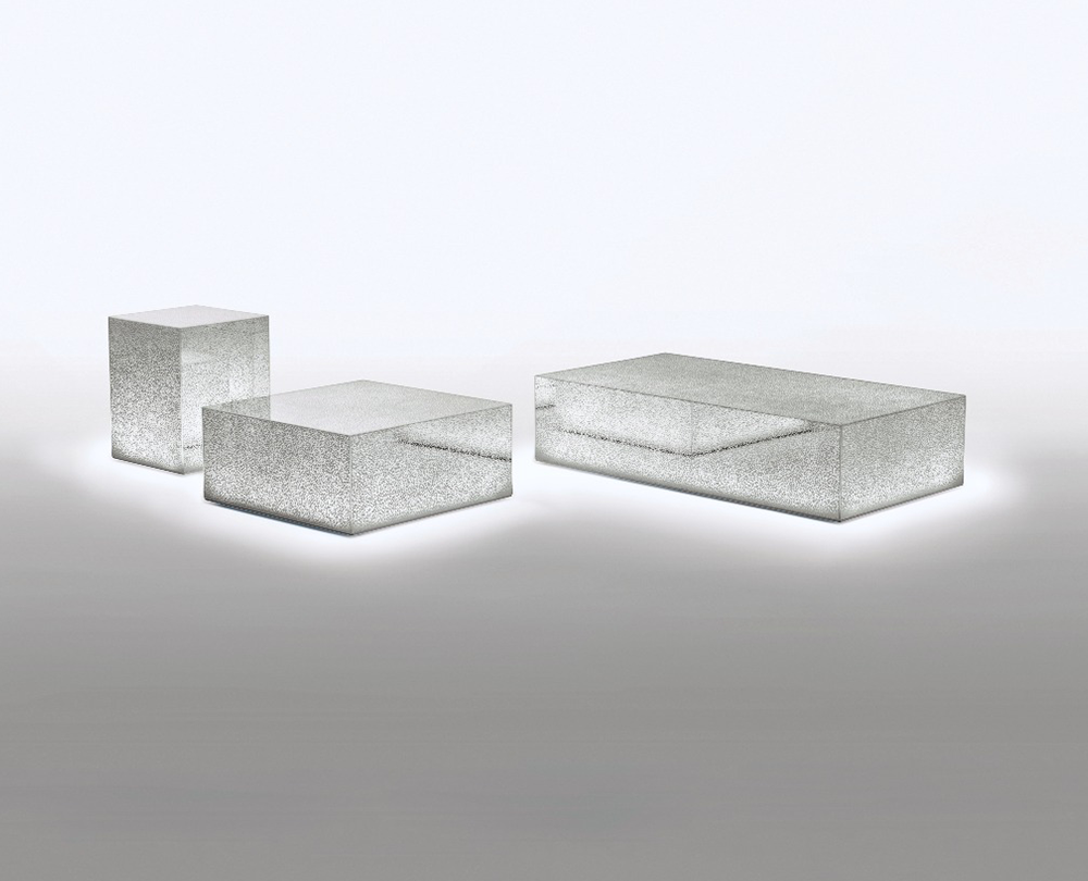 De Crack-collectie bestaat uit lage glazen tafels in een parallelepiped-vorm, met glas verlijmd onder 45°. Het oppervlak is voorzien van een gebarsten spiegel-effect, gescheiden door dunne witte, lichtgevende lijnen. Optioneel is een dimbare verlichting geïntegreerd, waardoor de tafels een subtiele gloed en poëtisch effect creëren. Verkrijgbaar in meerdere maten, geschikt als salontafel of bijzettafel.