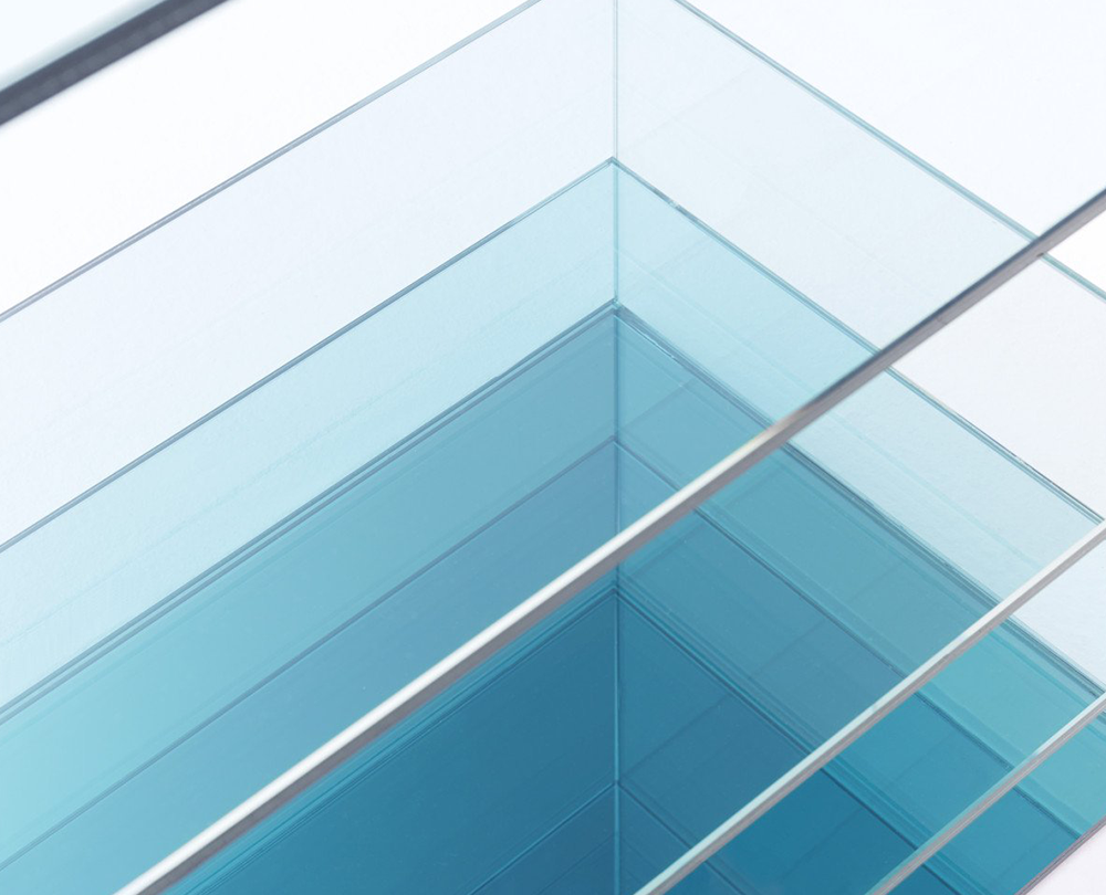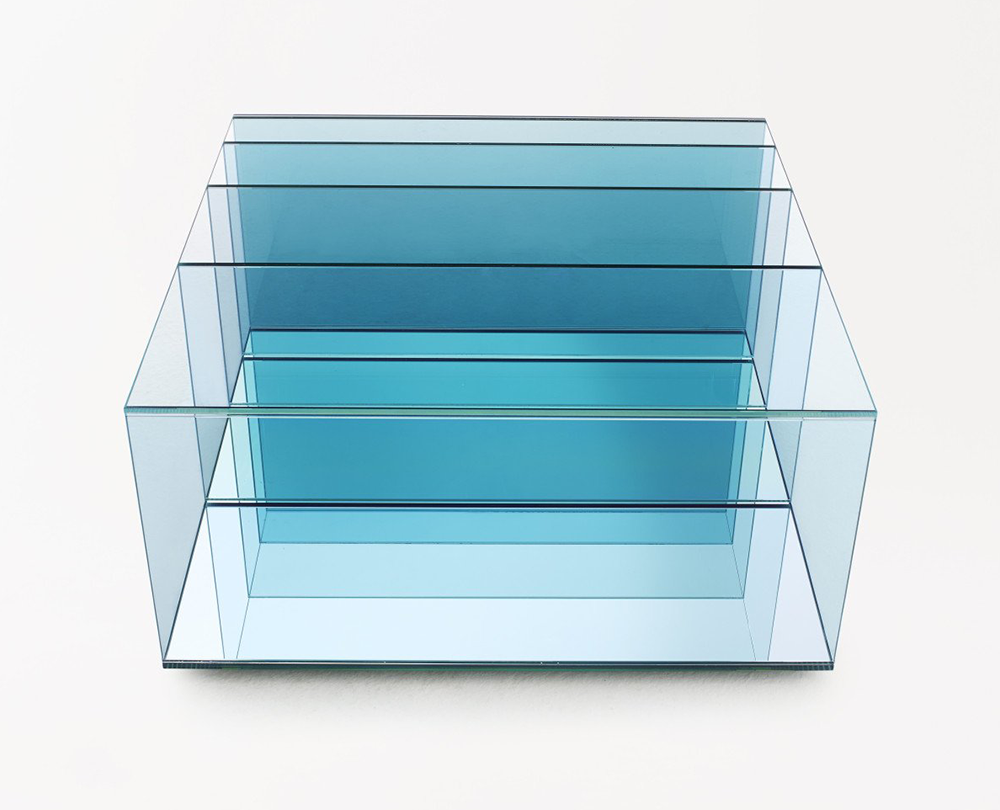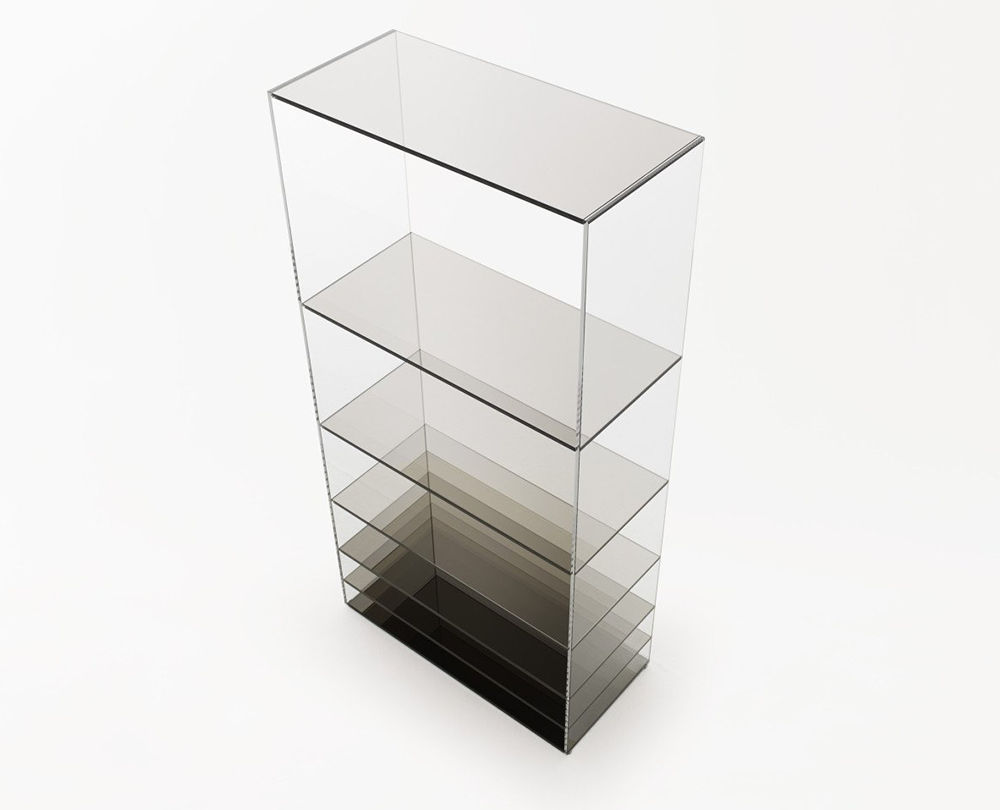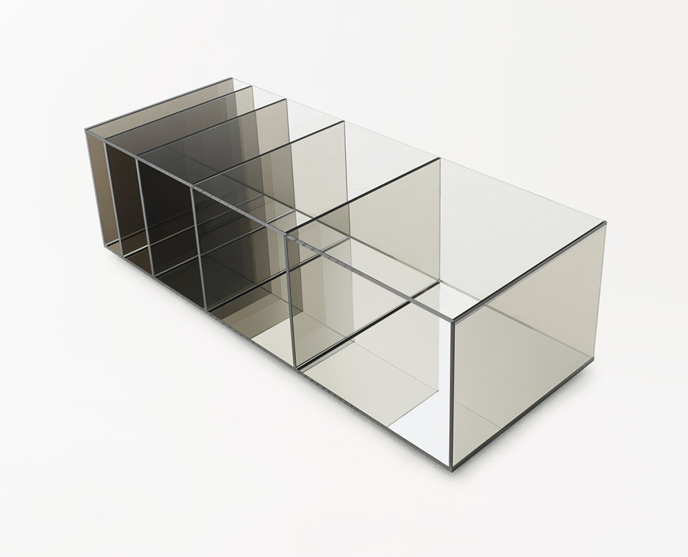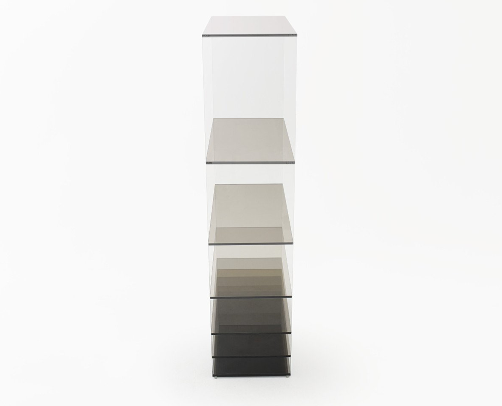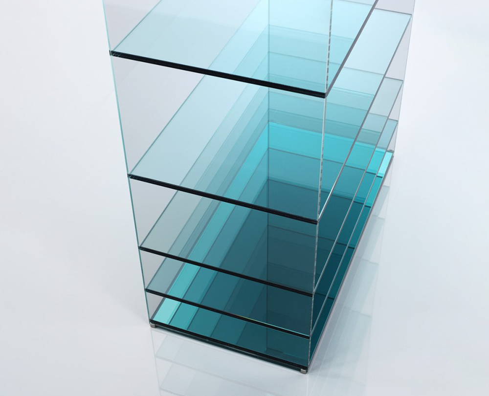 De Deep Sea-collectie van Nendo is een poëtisch spel van glas, licht en kleur dat de illusie van diepte oproept. De tafels en boekenkast zijn vervaardigd uit gelamineerd extralight glas, waarin verticale panelen van gekleurd glas – in grijze of blauwe tinten – subtiel tussen de lagen zijn geplaatst. Naarmate de panelen dichter bij elkaar komen, neemt ook de kleurintensiteit toe, alsof men afdaalt in het water. Een spiegel aan de basis versterkt het gevoel van transparantie en reflectie, waardoor elk stuk een serene, bijna meditatieve aanwezigheid krijgt in de ruimte.