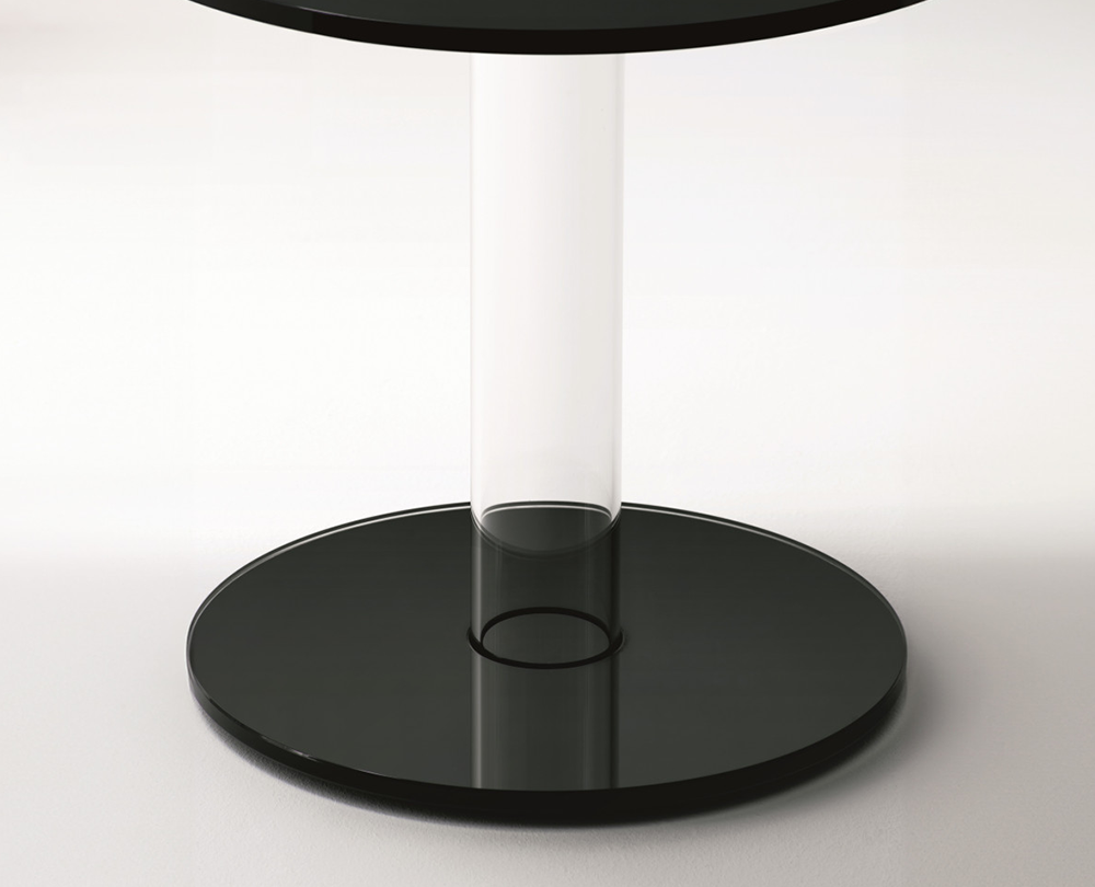 De Hub Tavoli Bassi serie van Piero Lissoni bestaat uit ronde lage tafels die elegantie en functionaliteit combineren. Het blad is gemaakt van 12 mm gehard glas, ondersteund door een holle cilinderbasis van borosilicaatglas, met een voet van eveneens 12 mm glas die voor ballast zorgt. De bovenkant en voet zijn leverbaar in glanzend of matte lakglasafwerking. Dankzij het demonteerbare bovenblad, bevestigd met ringen van roestvrij geanodiseerd aluminium, blijft het design zuiver en geordend.