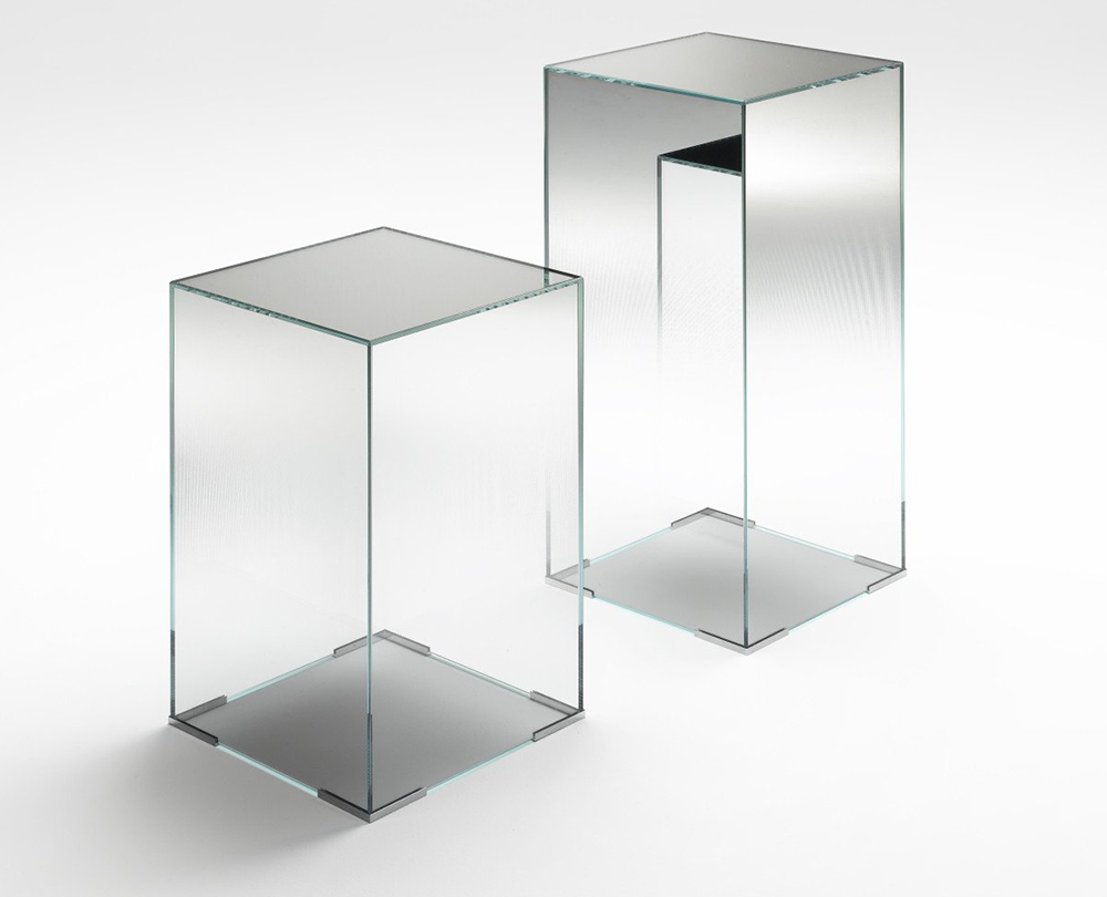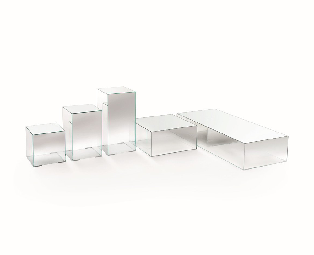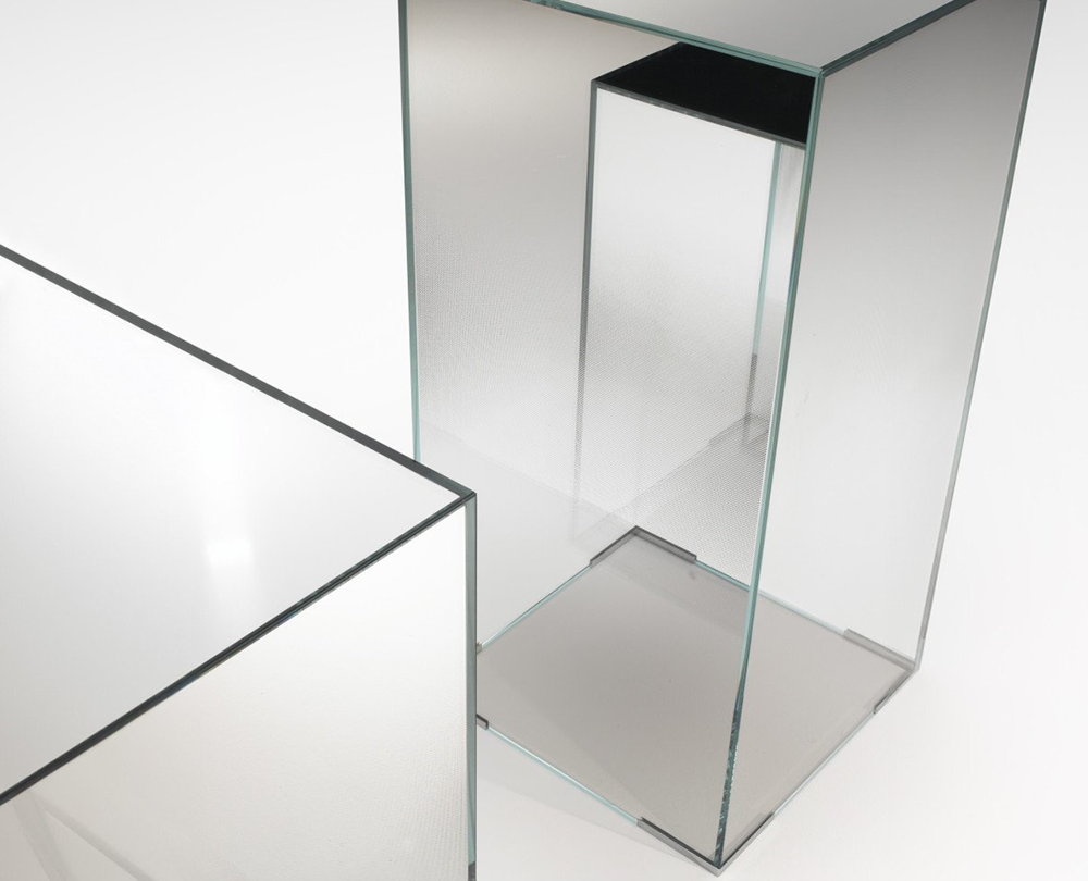 De Illusion collectie van Jean-Marie Massaud voor Glas Italia is een verfijnde serie lage tafels die de grenzen van glasbewerking verkennen. Elke tafel heeft een spiegelend bovenblad en zijden met een subtiele, aflopende spiegelafwerking die diepte en elegantie toevoegt. Gerealiseerd door het verlijmen van 45°-gevelde kristallen platen, creëert het ontwerp een visueel lichte en sculpturale aanwezigheid in elke ruimte. De aflopende spiegelafwerking kan kleine onregelmatigheden vertonen, wat als normaal wordt beschouwd en bijdraagt aan de unieke esthetiek van elk stuk.