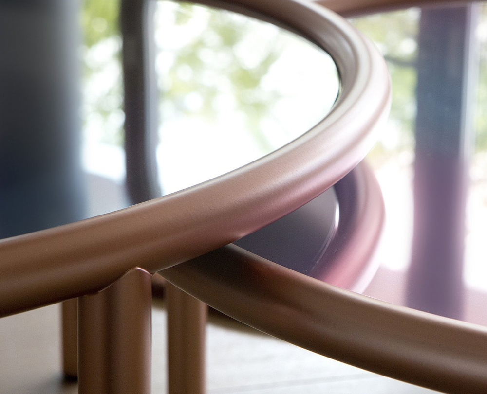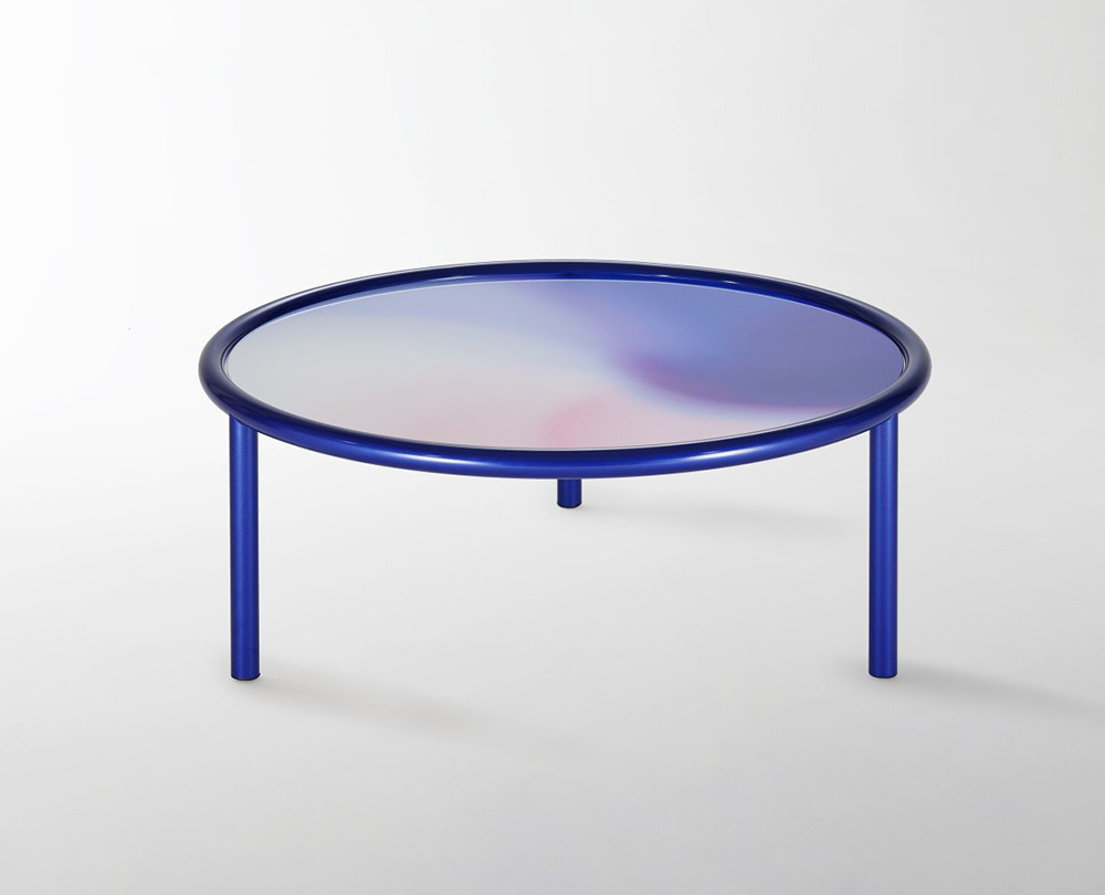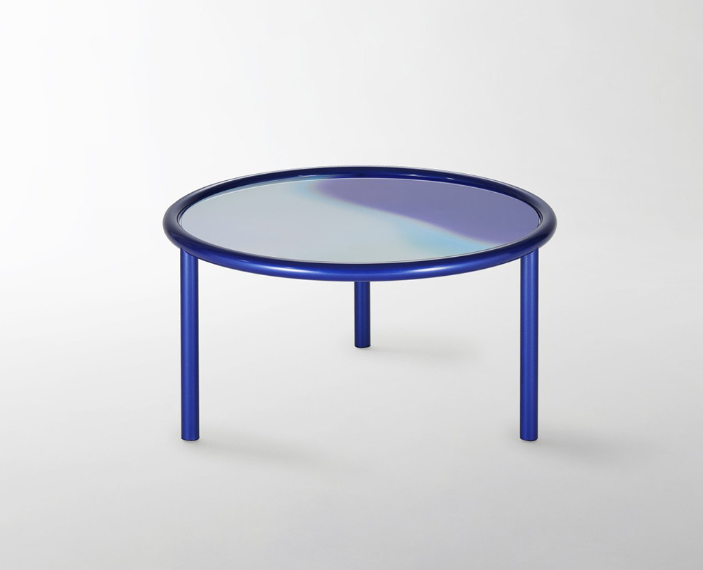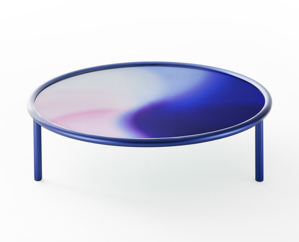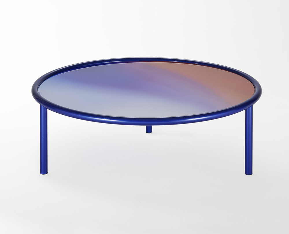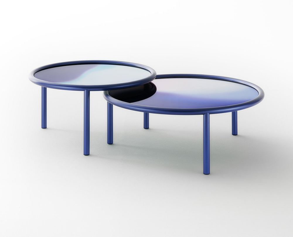 De L.A. Sunset tafels, ontworpen door Patricia Urquiola voor Glas Italia, zijn lage, ronde salontafels met een slanke metalen buisstructuur in een matte, metallic afwerking in de kleuren parelachtig nachtblauw of koper. Het bovenblad is vervaardigd uit gelaagd glas met een spiegel- of opaleffect, waardoor een palet van kleuren ontstaat die zich mengen als gassen of vloeistoffen. Dit effect verbergt de vaste toestand van het materiaal en geeft de tafels een dynamisch en etherisch karakter. Het spiegelende oppervlak voegt energie en helderheid toe aan de kleurtonen, waardoor elke tafel een uniek visueel statement maakt.