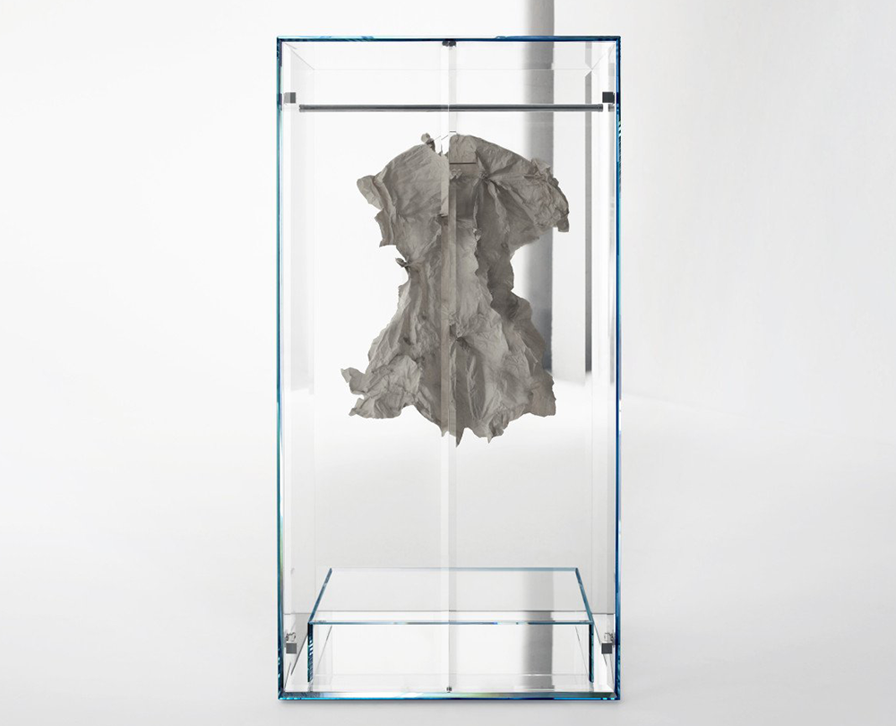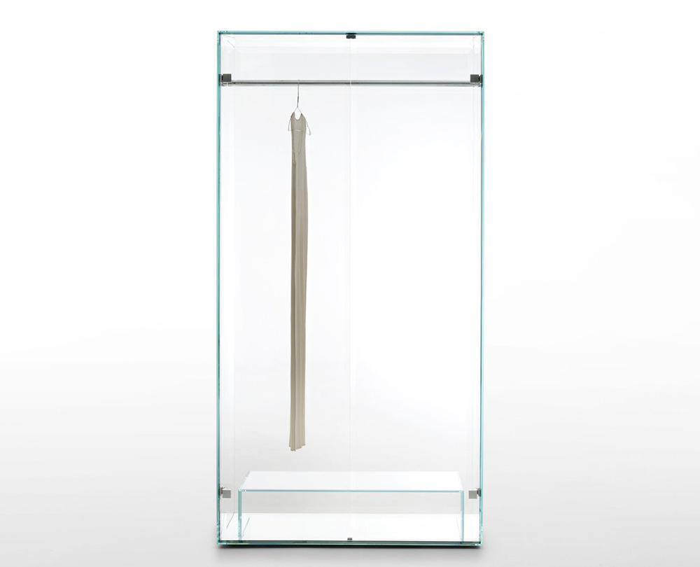De Prism Glass Wardrobe, ontworpen door Tokujin Yoshioka voor Glas Italia, is een verfijnde garderobekast uitgevoerd in 12 mm transparant extralight gehard glas, zorgvuldig thermisch verlijmd en voorzien van precisiegeslepen facetten die het licht op spectaculaire wijze breken en weerkaatsen. De basis is vervaardigd uit extralight spiegelglas, met kledingroede en beslag in gepolijst staal.