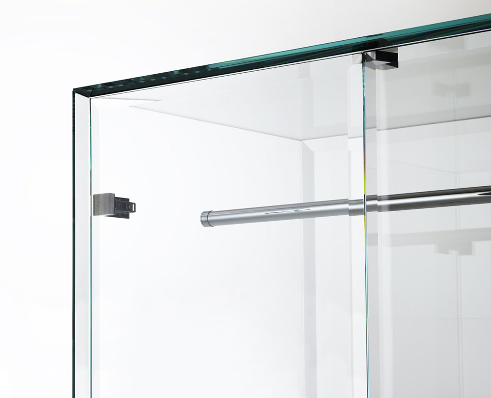 Onderin kan een glazen bankje in dezelfde stijl worden geplaatst — dit element is optioneel en kan ook worden weggelaten, afhankelijk van de gewenste uitvoering. De deuren in 8 mm gehard extralight glas hebben blu-motion soft-close scharnieren en elegante glazen handgrepen. Dankzij het kristalheldere glas worden kleding en objecten binnenin schitterend uitgelicht, alsof ze in een transparante vitrine gepresenteerd worden.