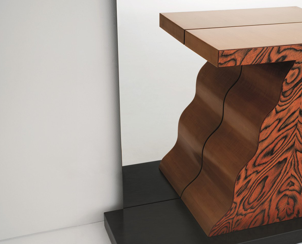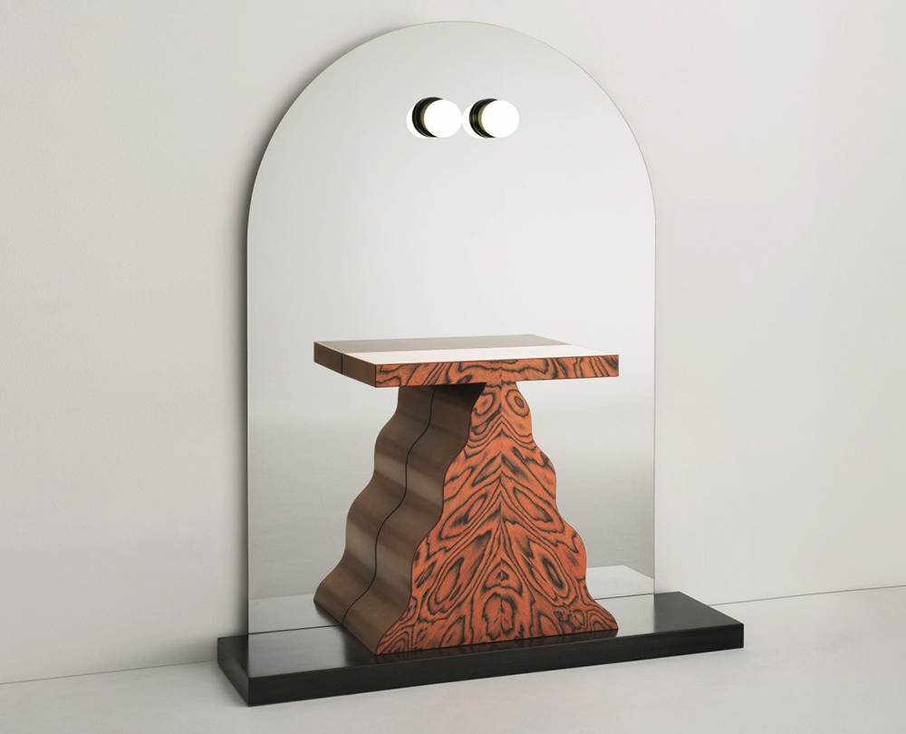 De Sybilla spiegel, ontworpen door Ettore Sottsass voor Glas Italia, is een sculpturaal designobject dat de grens tussen kunst en meubel doorbreekt. Deze vrijstaande spiegel is voorzien van een geïntegreerde console en rust op een stevige basis van aniline-gevernist hout. De structuur is afgewerkt met een elegant parel- en Alpi-fineer, zorgvuldig vervaardigd volgens de kenmerkende stijl van Sottsass, die symmetrie, kleur en materialiteit op poëtische wijze combineert.