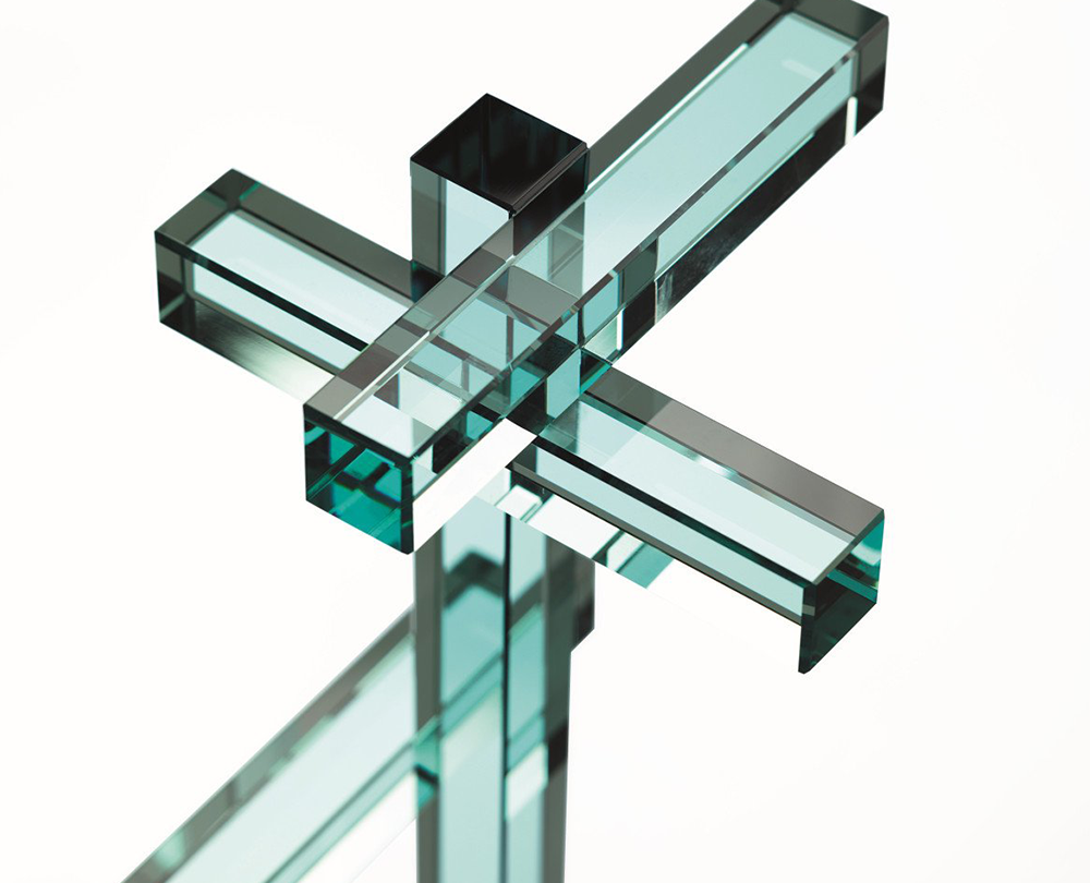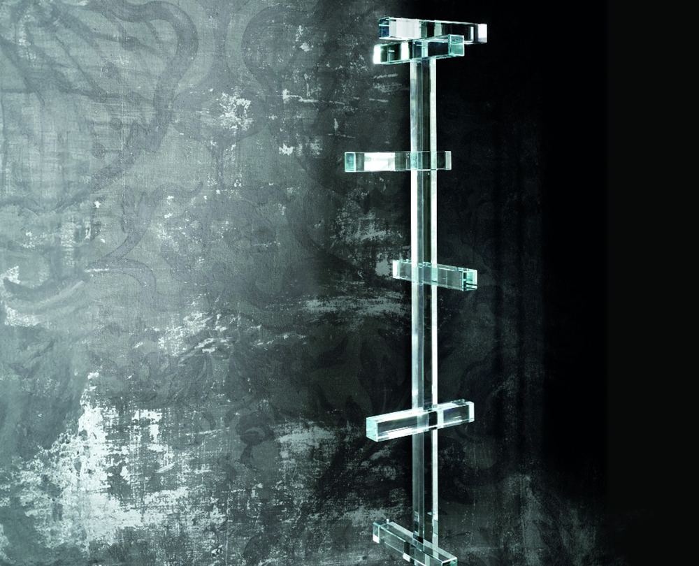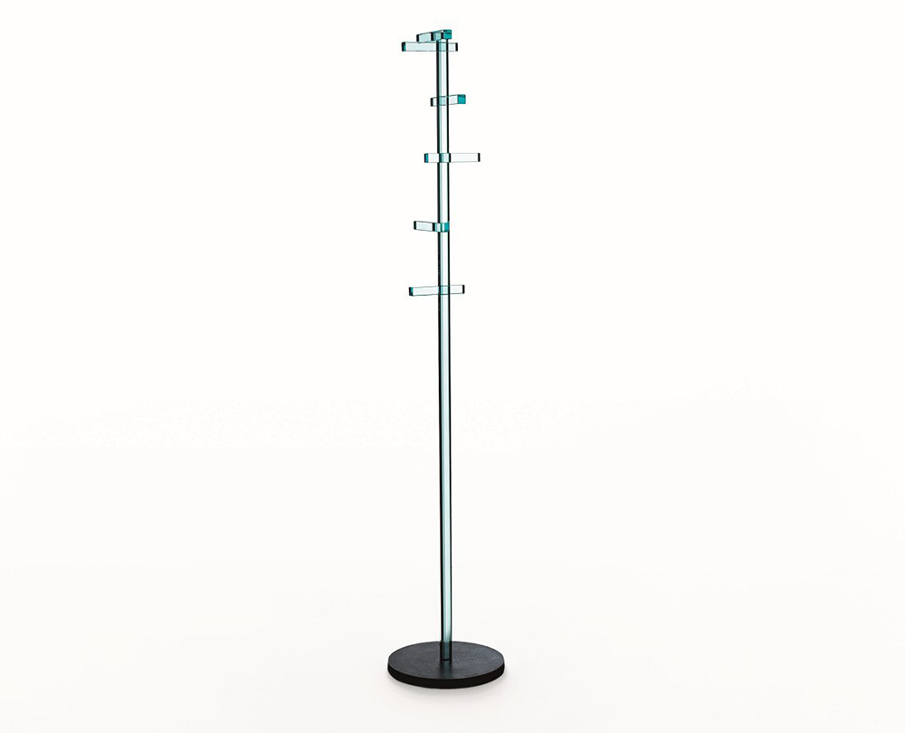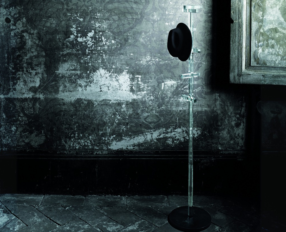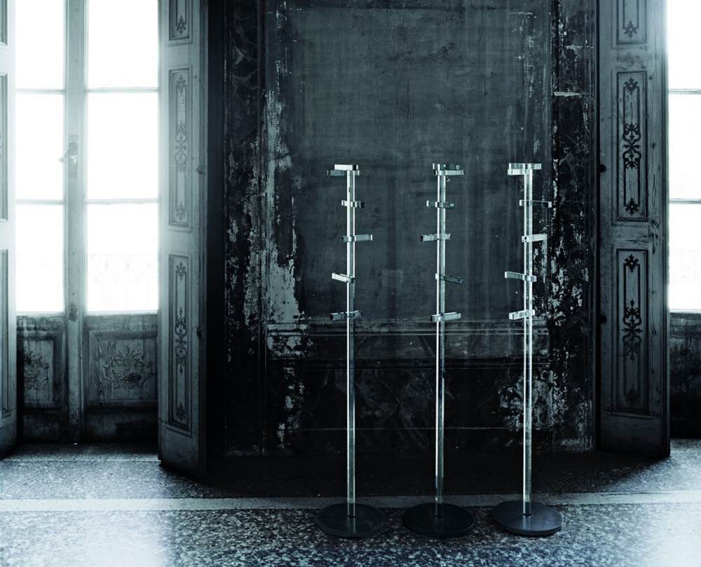Telegrafo, ontworpen door Piero Lissoni voor Glas Italia, is een kapstok die uitblinkt in lichtheid en precisie. De slanke stam bestaat uit vierkante staven van 24 × 24 mm dik transparant glas, die met een geavanceerd lijm- en jointsysteem zijn bevestigd aan een massieve basis van ruw ijzer. Dankzij een speciaal hardingsproces is het glas bestand tegen hoge belastingen, ondanks de verfijnde uitstraling. Het ongepolijste, robuuste karakter van de ijzeren voet vormt een sterk contrast met de zuivere, bijna etherische transparantie van het glazen frame — een perfecte balans tussen industrieel en elegant design.