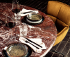 Het tafelblad is gemaakt van Rosso Lepanto serpentijn, een prachtige natuursteen met een rode kleur en intrigerende aderpatronen. Elke tafel is uniek vanwege de natuurlijke variaties in het gesteente, waardoor een exclusieve uitstraling wordt gecreëerd.