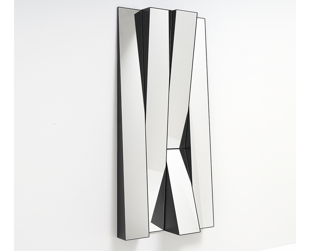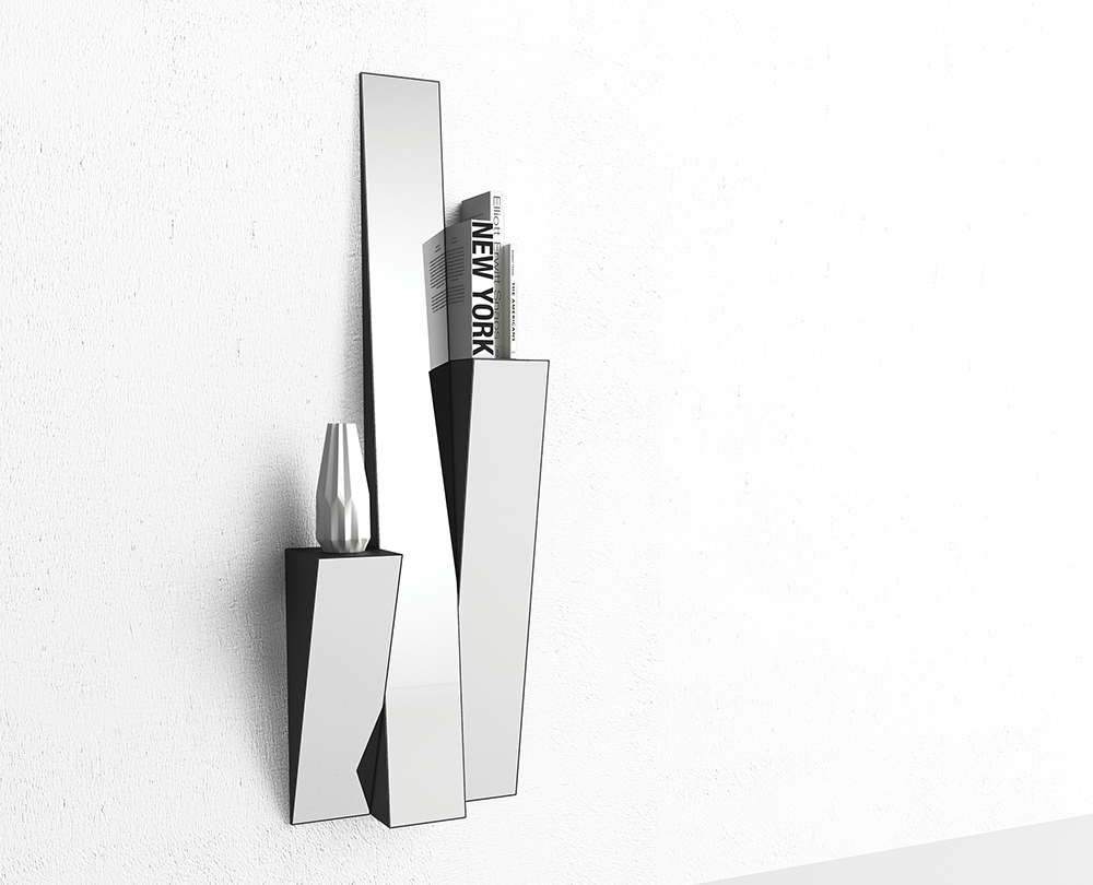 De Minotti Italia Look spiegelwandplank, ontworpen door Studio14 voor Minotti Italia, is een uitgesproken designobject dat functionaliteit en geometrische elegantie samenbrengt. De driehoekige metalen planken in antraciet worden gekenmerkt door een spiegelend front, wat zorgt voor een speels effect van reflectie en ruimtelijkheid in elk interieur. Dankzij de beschikbaarheid in drie verschillende formaten en de mogelijkheid om zowel horizontaal als verticaal te monteren, biedt de Look wandplank maximale flexibiliteit in compositie en toepassing. Het resultaat is een grafisch en architecturaal element dat zowel praktisch als visueel verrijkend is.