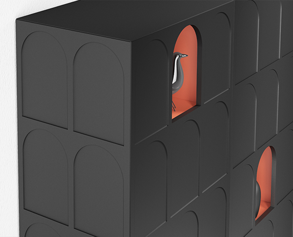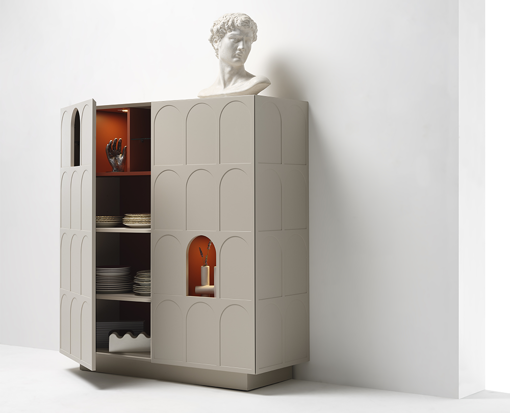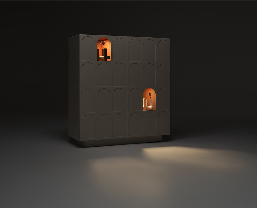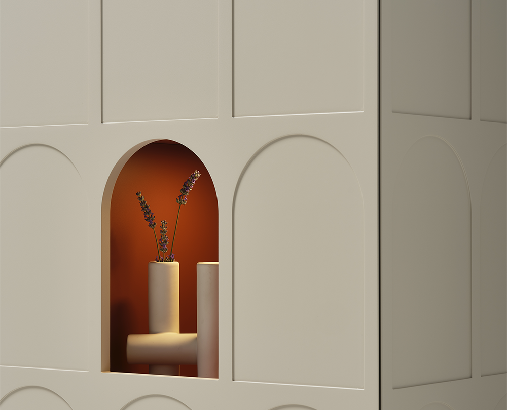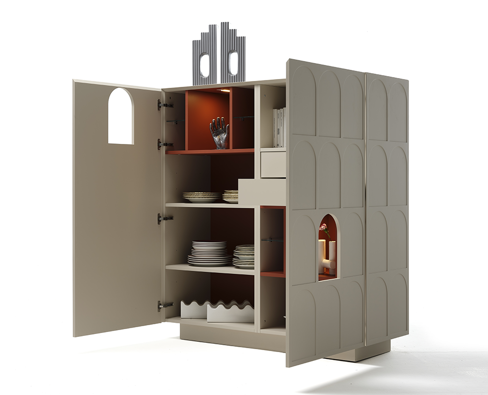 Achter de twee draaideuren bevinden zich praktische opbergmogelijkheden met interne lades en in hoogte verstelbare legplanken, terwijl de open niches een speels contrast bieden en optioneel in een afwijkende kleur uitgevoerd kunnen worden. Deze niches zijn voorzien van een geïntegreerd, oplaadbaar LED-verlichtingssysteem (USB) met bewegingssensor, waarbij zowel lichtintensiteit als warmte instelbaar zijn. De strakke plint van 10 cm, in dezelfde kleur en afwerking als de kast, zorgt voor een rustig en uniform geheel. De Roma dressoir kast wordt geleverd in drie delen voor een efficiënte levering en installatie, en combineert esthetiek met slimme functionaliteit voor een modern interieur.