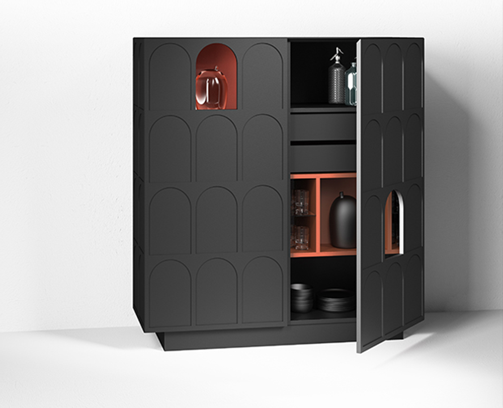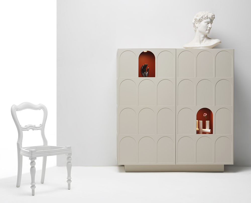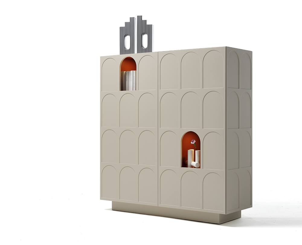 De Minotti Italia Roma dressoir kast, ontworpen door Diego Sferrazza voor Minotti Italia, is een uitgesproken meubelstuk waarin geometrisch design en functionele verfijning samenkomen. De kast is uitgevoerd in een moderne matt sand white of in een matt black afwerking en kenmerkt zich door de grafische belijning op de deuren en zijkanten, wat zorgt voor een architectonisch en eigentijds karakter.