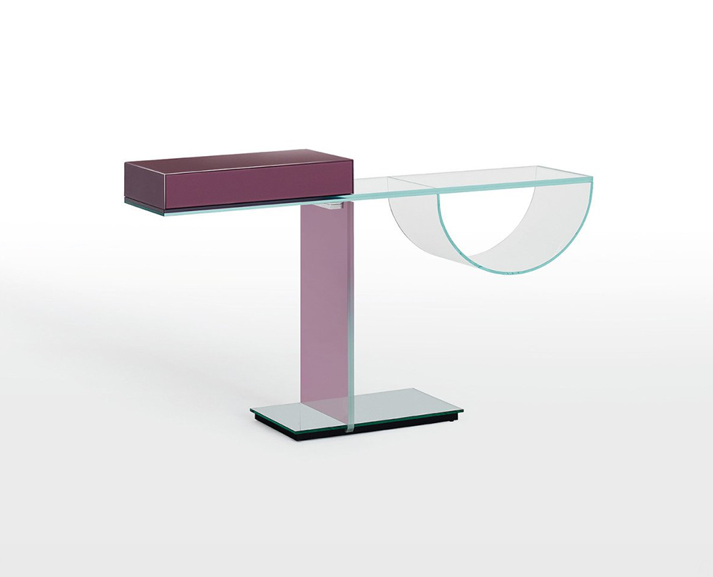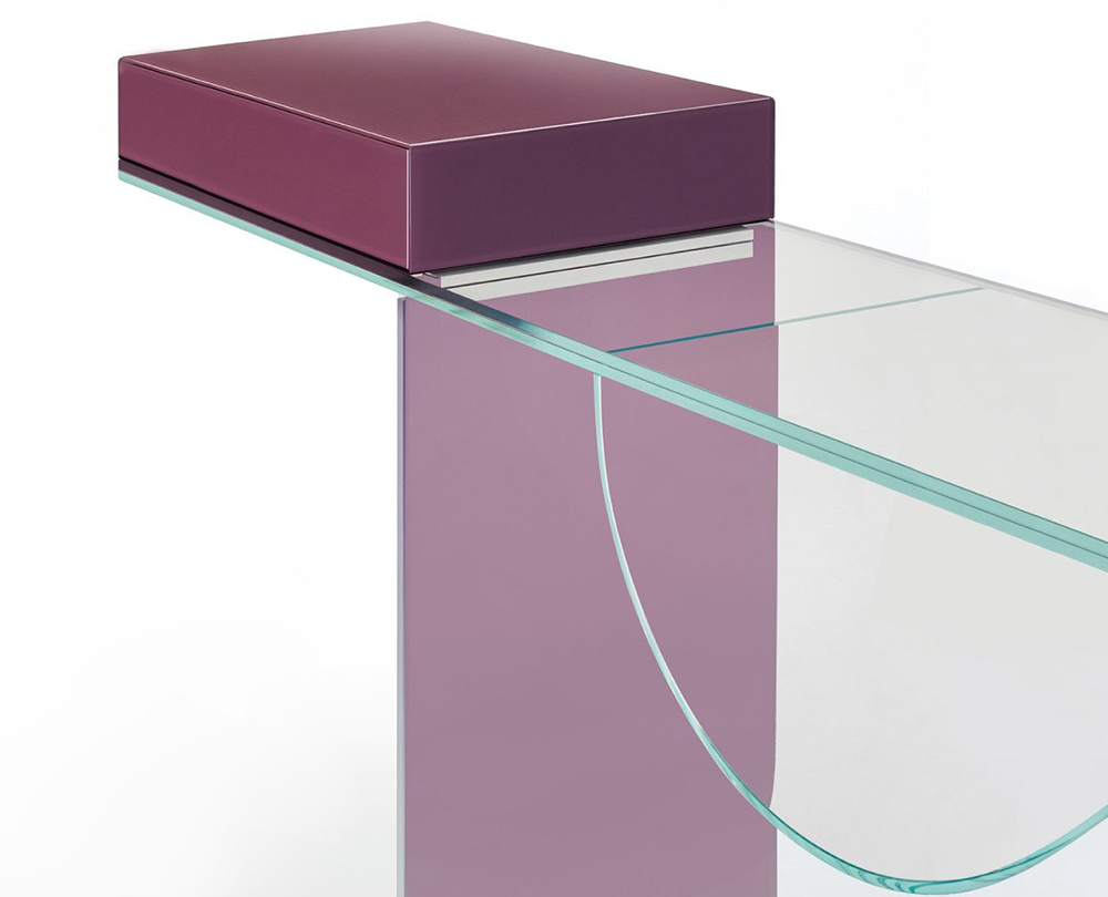 De Ollie Console combineert innovatieve technische oplossingen met verfijnde esthetiek. Het gebogen extra-clear glazen blad biedt opbergruimte, terwijl de verticale stand en spiegelvoet een elegante, modulaire structuur vormen, afgewerkt in paars-lila glas