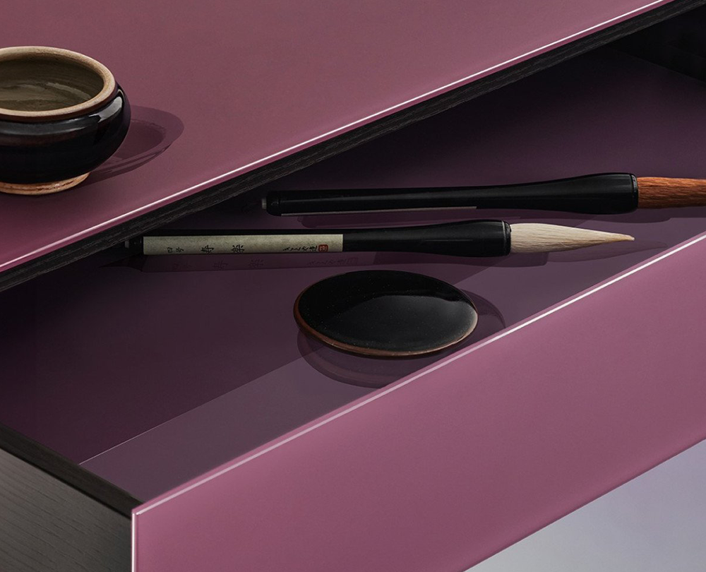 Bovenop bevindt zich een lade met push-pull mechanisme, afgewerkt met hoogglans gelakt glas. De verticale steun is vervaardigd uit 12+12 mm gelamineerd gehard, gekleurd transparant glas. Het blad en de verticale steun worden verbonden met spiegelgepolijste metalen platen, waardoor montage en demontage eenvoudig zijn.