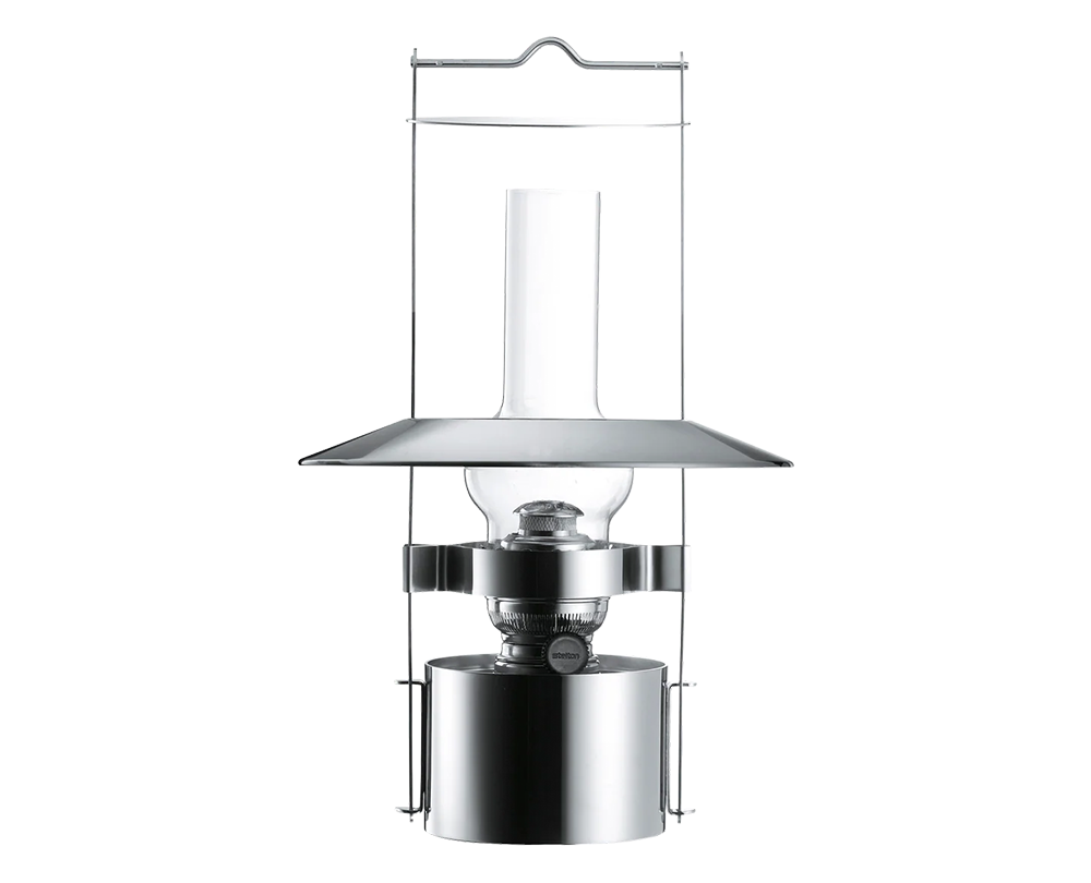 De Stelton EM Scheepslamp H 43 cm, ontworpen door Erik Magnussen, is een eigentijdse interpretatie van de klassieke scheepslamp. Het cilindrische ontwerp in satijngepolijst roestvrij staal combineert maritieme robuustheid met Scandinavisch minimalisme. De constructie beschermt de vlam tegen wind, waardoor de lamp zowel binnen als buiten betrouwbaar licht biedt. Dankzij de heldere cilinder van borosilicaatglas verspreidt het licht zich rustig en sfeervol. De lamp werkt op kerosine of lampolie en kan op een tafel of op de grond worden geplaatst, maar ook worden opgehangen met een speciale stalen houder.