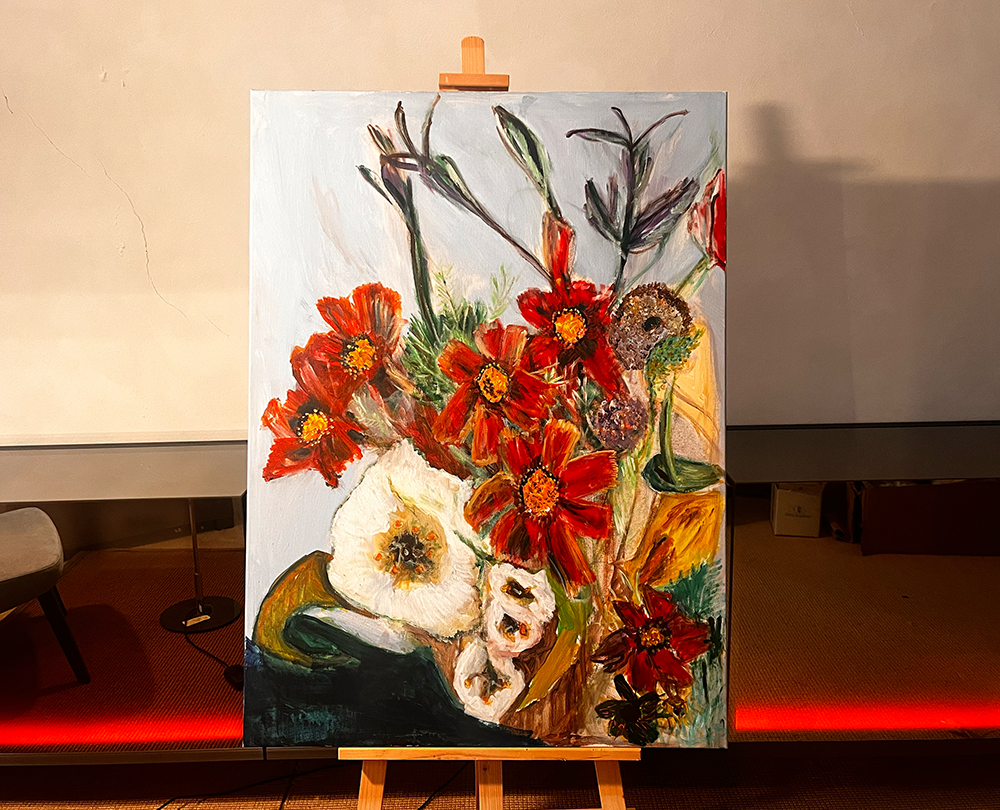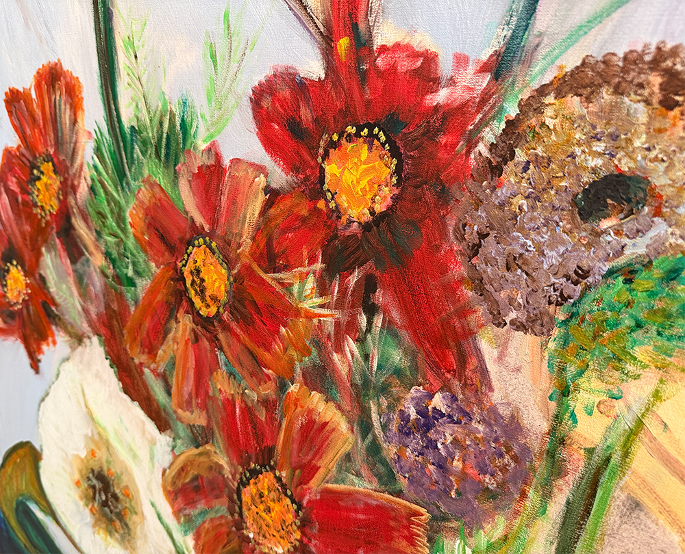 Dit expressieve bloemenschilderij toont een levendig veldboeket met rode en witte bloemen, geschilderd door Filip Tillema. De warme kleuren maken het kunstwerk een opvallende blikvanger voor elk interieur. Ideaal voor liefhebbers van unieke wanddecoratie.