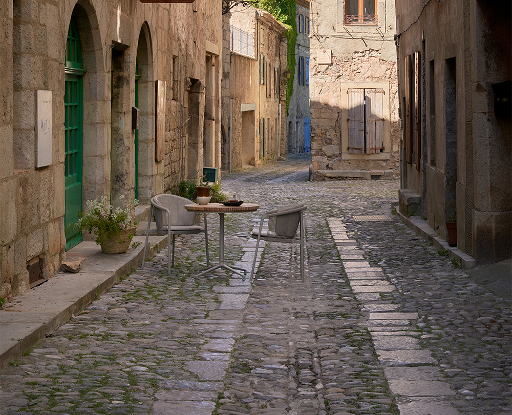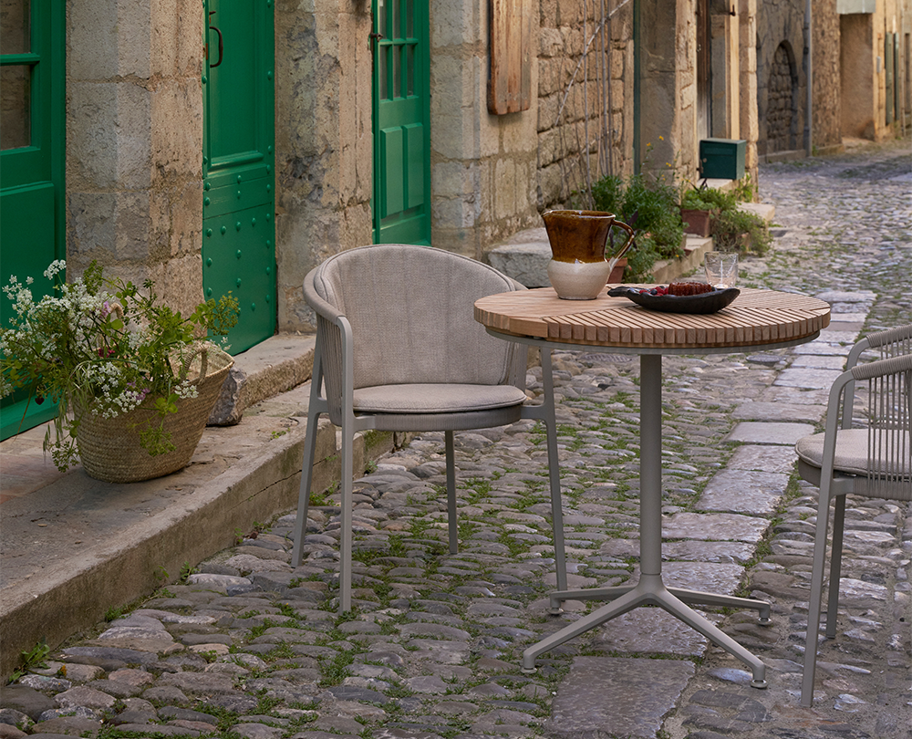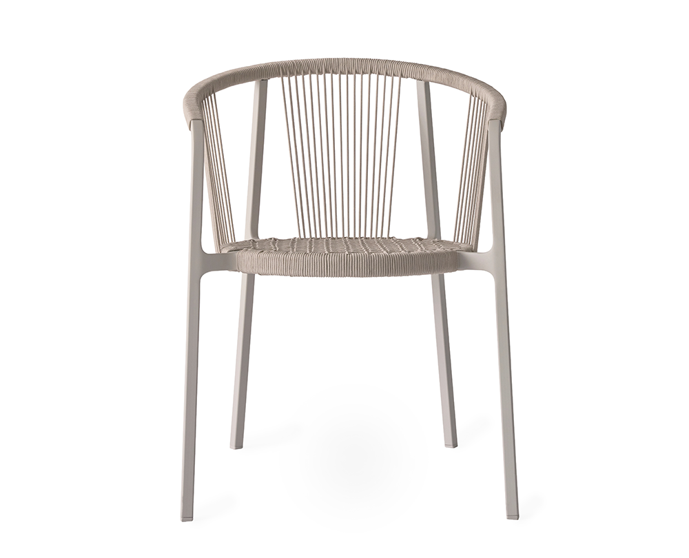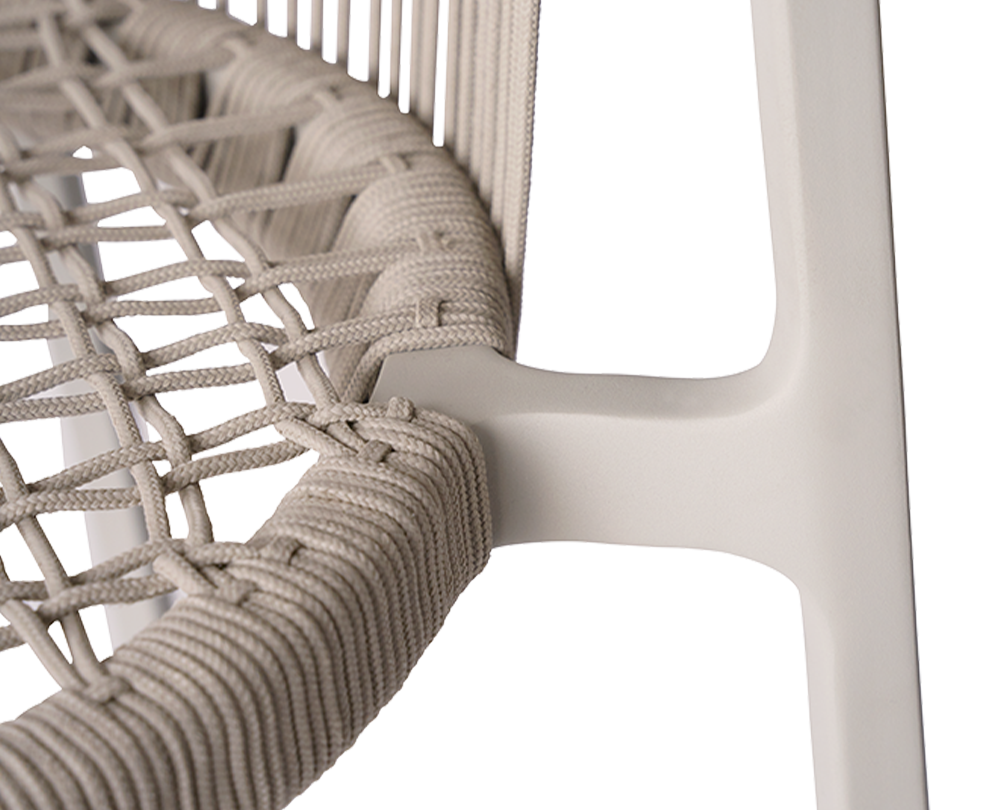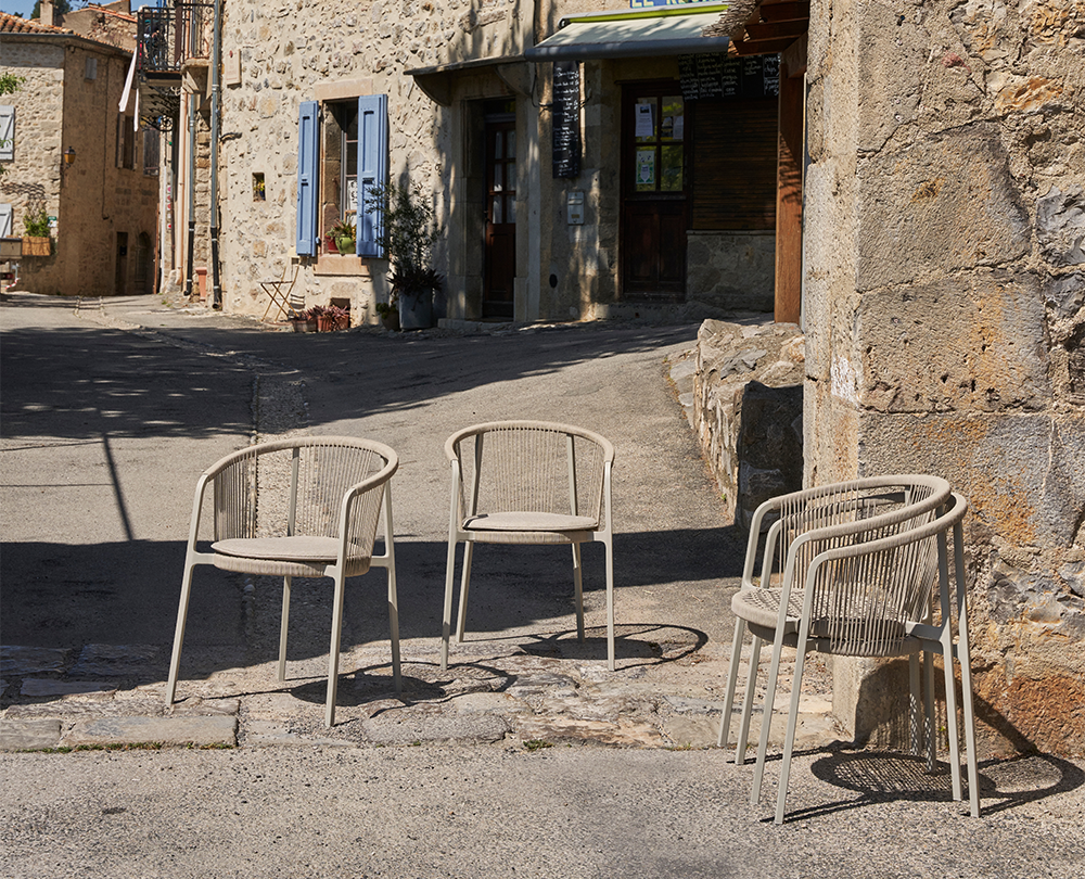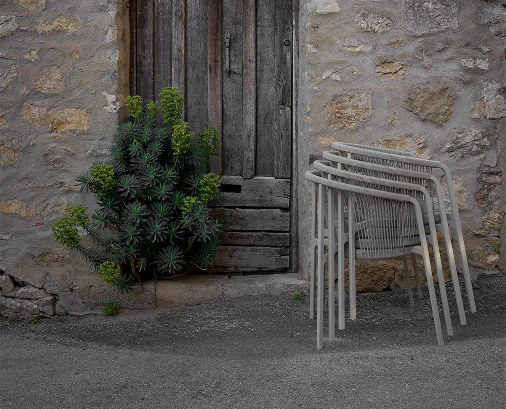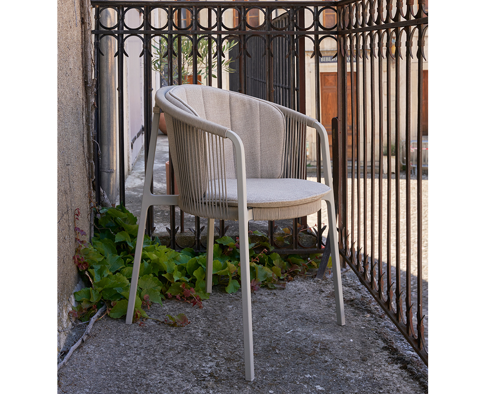 De Vipp 710 Lagrasse stoel is een stapelbare outdoorstoel met gepoedercoat aluminium frame, ronde rugleuning en geweven koorddetails. Geschikt voor buitengebruik en uitbreidbaar met comfortabele, weerbestendige kussens.