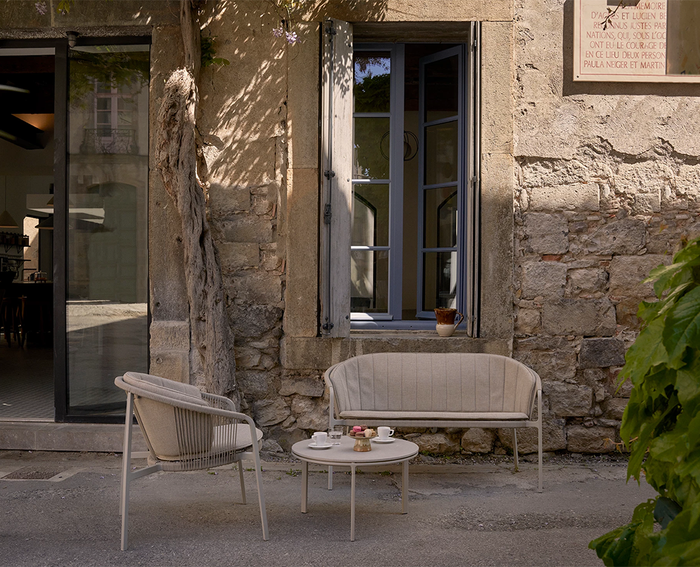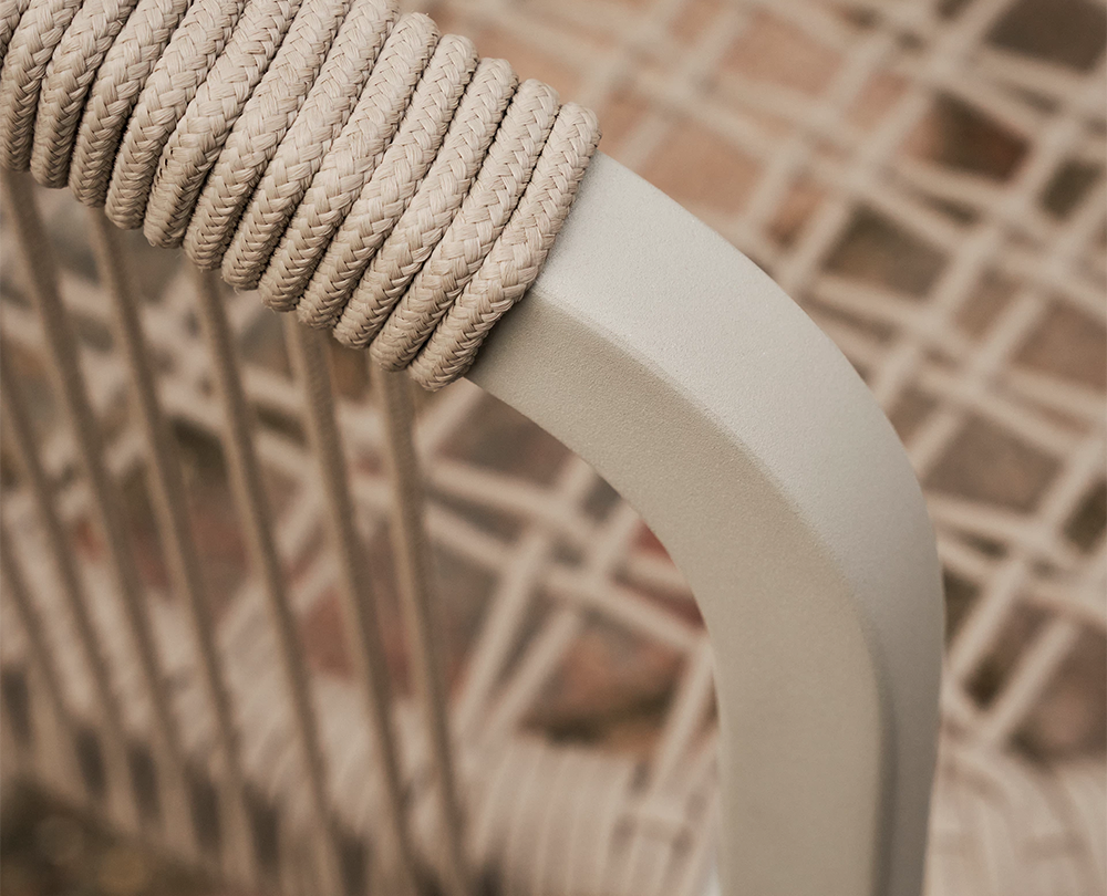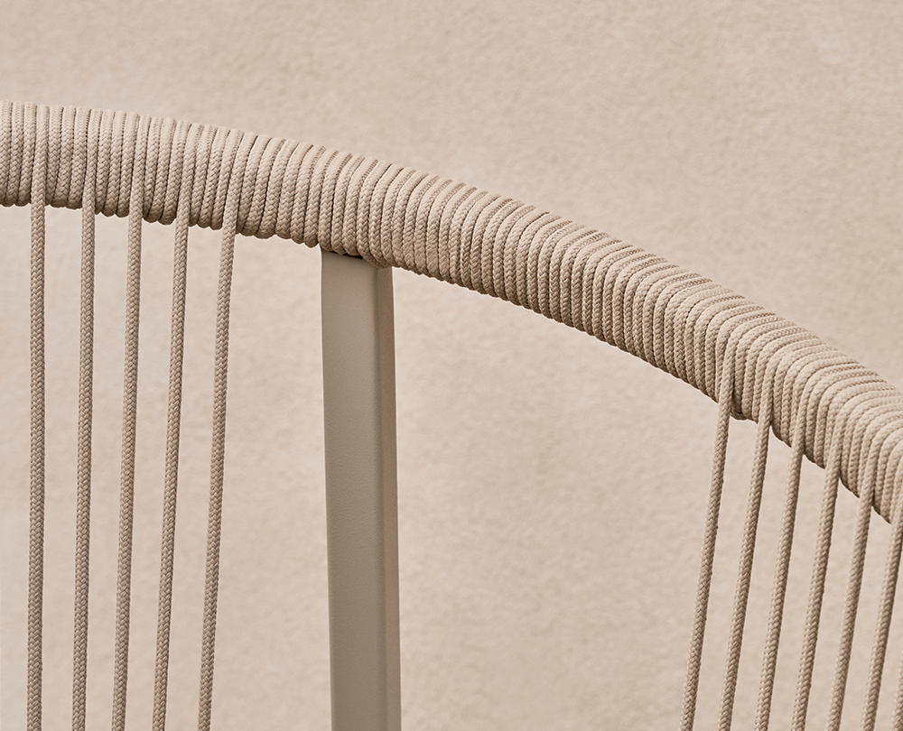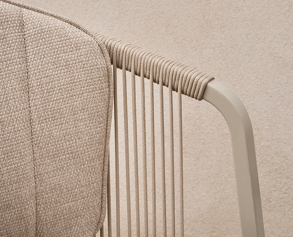 De Vipp 712 Lagrasse fauteuil biedt een ontspannen, comfortabele zitervaring voor buiten. Het schuine ontwerp van de stoel nodigt uit tot loungen, terwijl het gepoedercoate aluminium frame lichtgewicht, duurzaam en bestand tegen de elementen is. Het frame is omlijst met elegant geweven koord, een kenmerkend detail van de Lagrasse-collectie, en kan stapelbaar worden opgeborgen voor gemakkelijke opslag. De fauteuil kan worden aangevuld met bijpassende kussens in Vipp’s speciaal ontwikkelde buitenstof Dune, waardoor comfort en stijl perfect samenkomen. Het harmonieuze samenspel van frame, koord en kussens zorgt voor een verfijnde, tijdloze uitstraling in iedere buitenruimte.