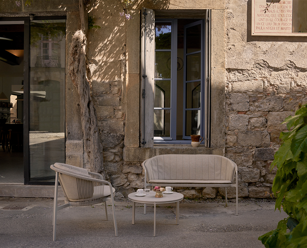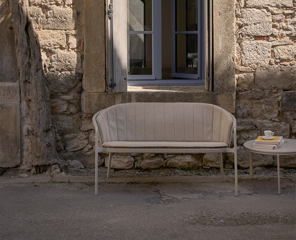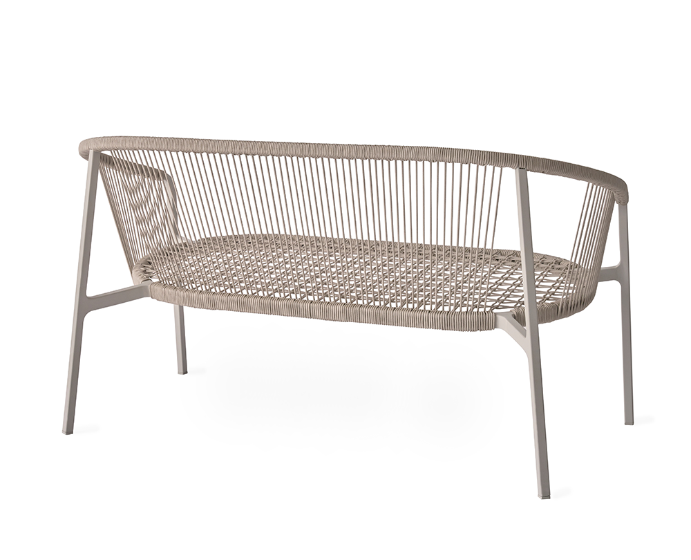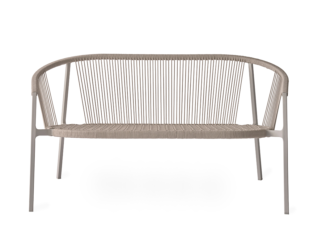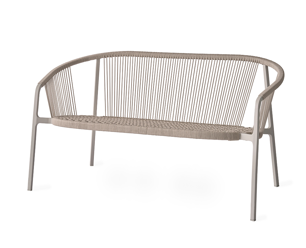 De Vipp 721 Lagrasse 2-zits bank is een stapelbare outdoorbank met aluminium frame, gebogen rugleuning en geweven koorddetails. Geschikt voor kleinere buitenruimtes en uitbreidbaar met weerbestendige, comfortabele kussens.