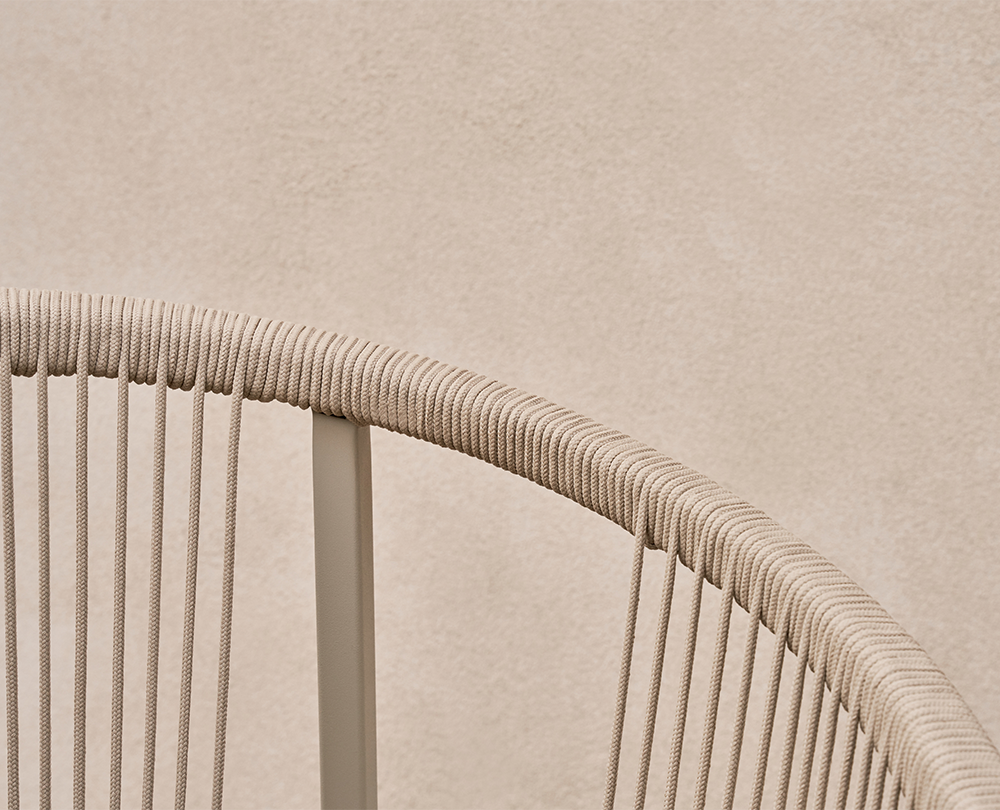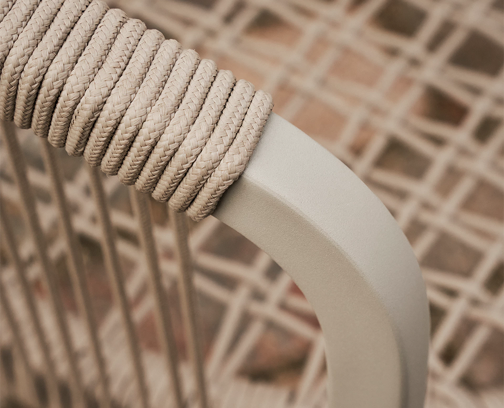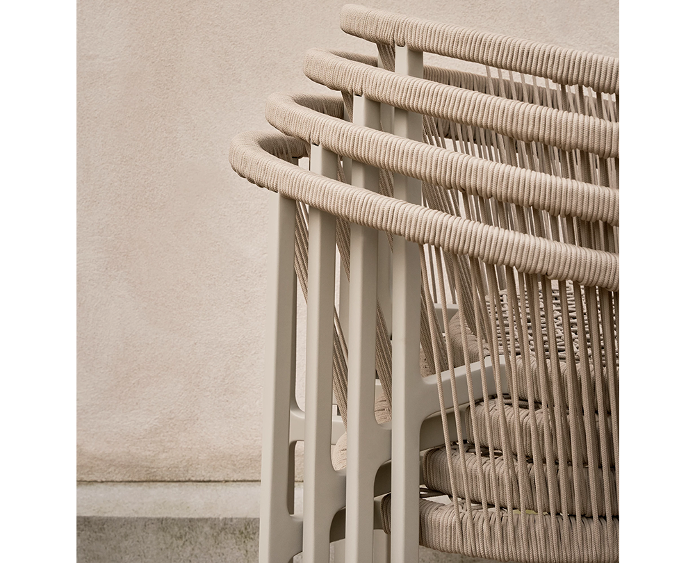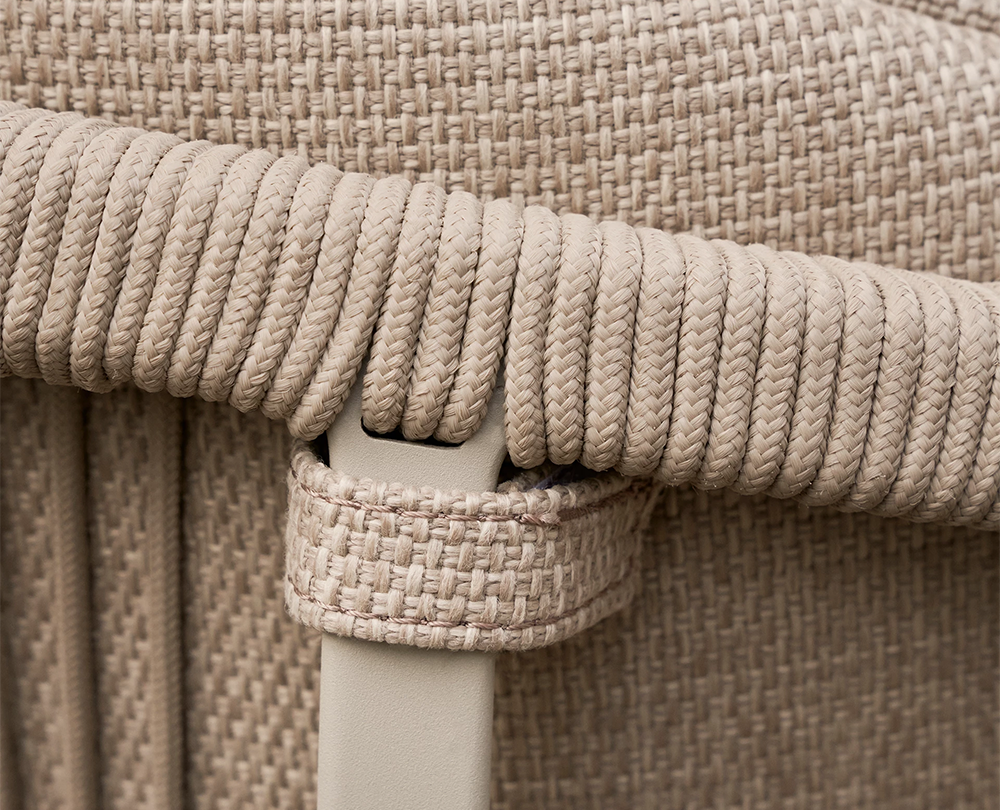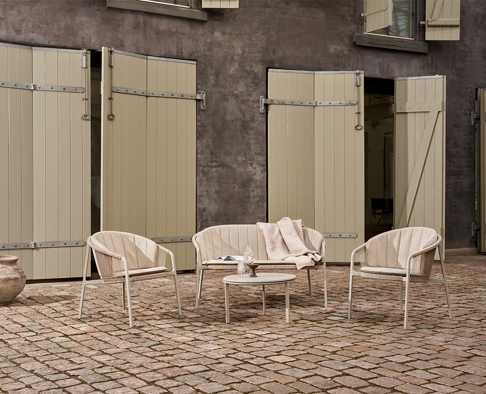 De Vipp 721 Lagrasse 2-zits bank is een stapelbare outdoorbank met aluminium frame, gebogen rugleuning en geweven koorddetails. Geschikt voor kleinere buitenruimtes en uitbreidbaar met weerbestendige, comfortabele kussens.