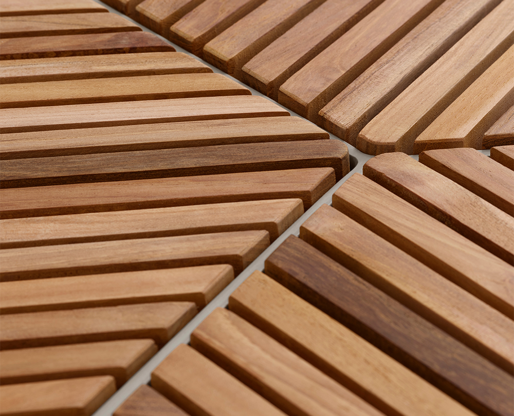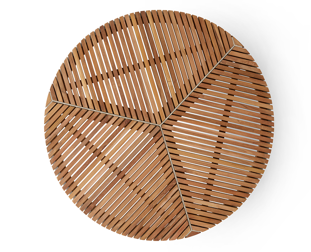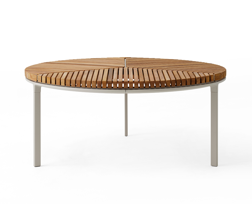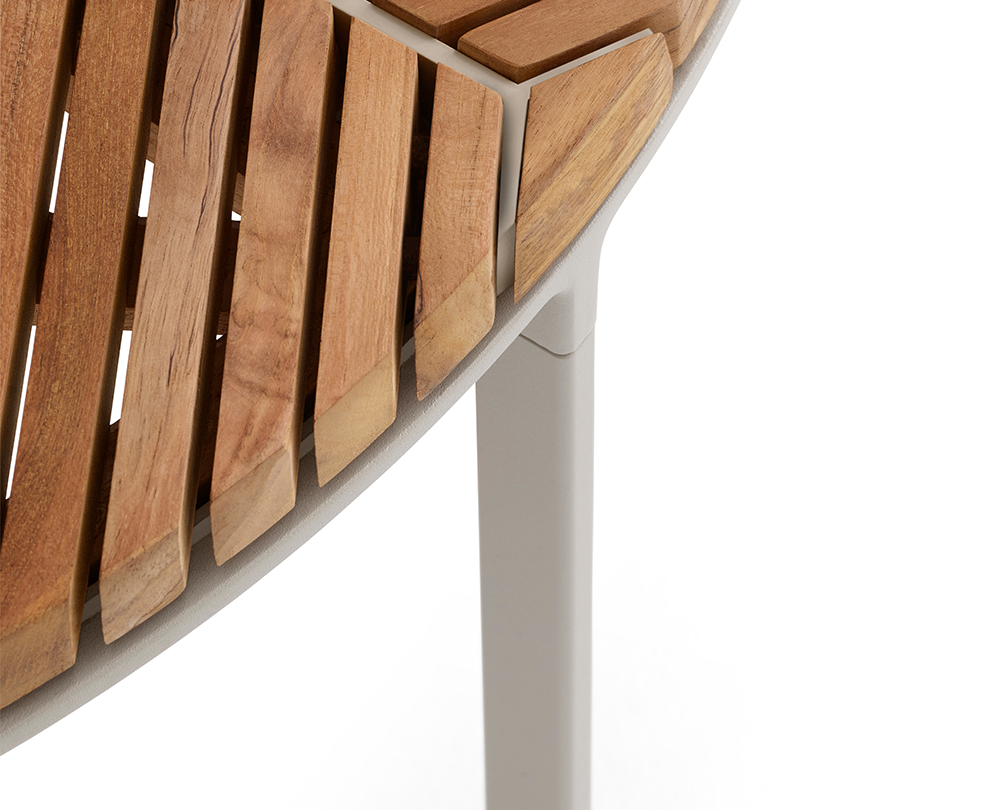 De salontafel is gemaakt van hoogwaardige materialen zoals gepoedercoat aluminium, waardoor het bestand is tegen de elementen en een lange levensduur heeft. Het tafelblad heeft een diameter van 90 cm en is gemaakt teak, wat zorgt voor een elegante en moderne uitstraling.