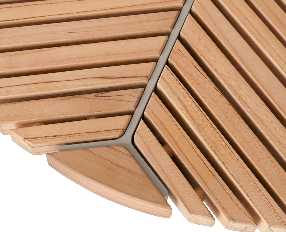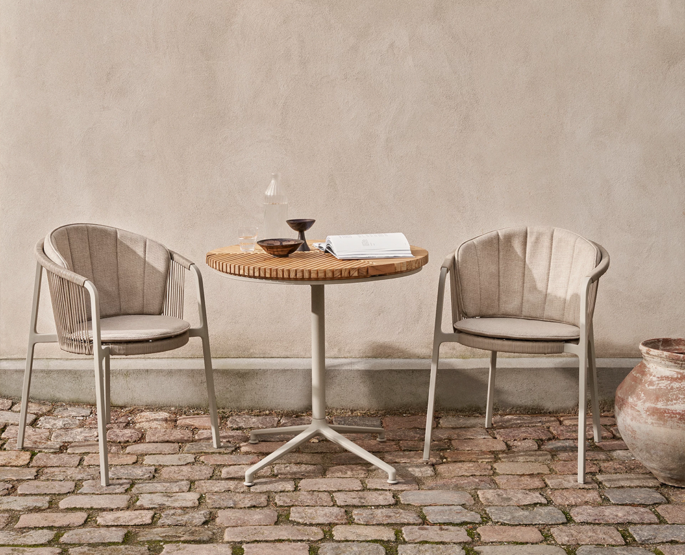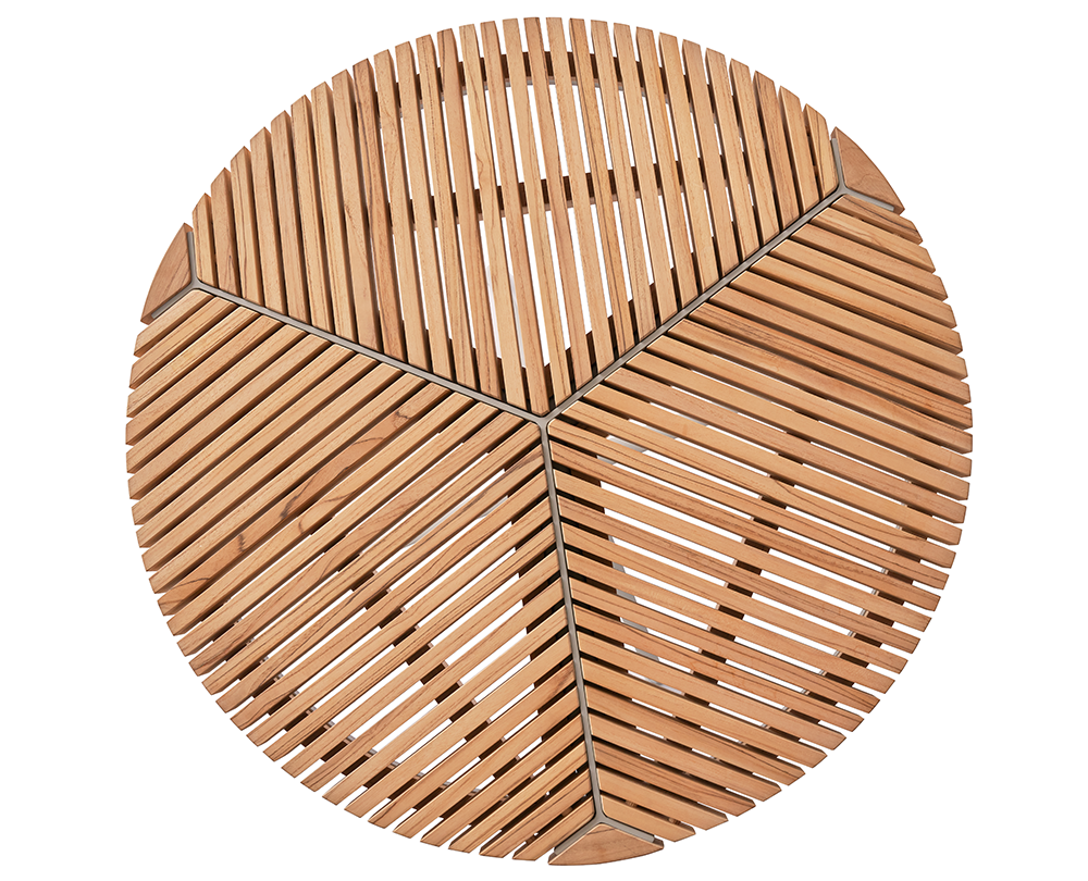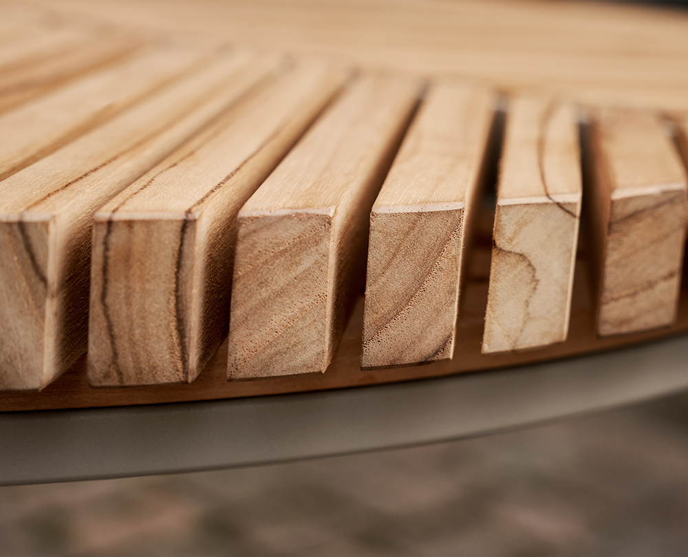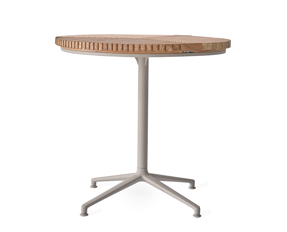 De Vipp 717 Open-Air Café bijzettafel combineert een grafisch teak tafelblad met een gepoedercoat aluminium onderstel. Weerbestendig, compact en voorzien van verstelbare stelvoeten voor stabiele plaatsing buitenshuis.
